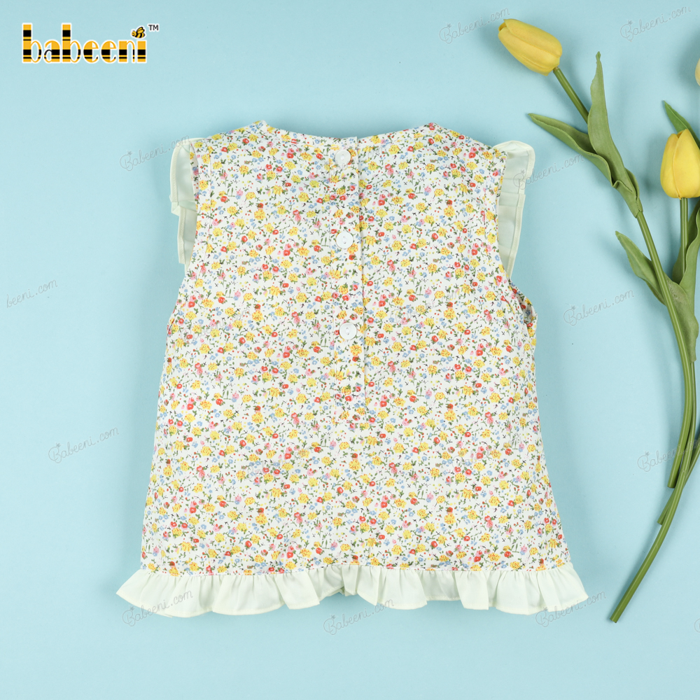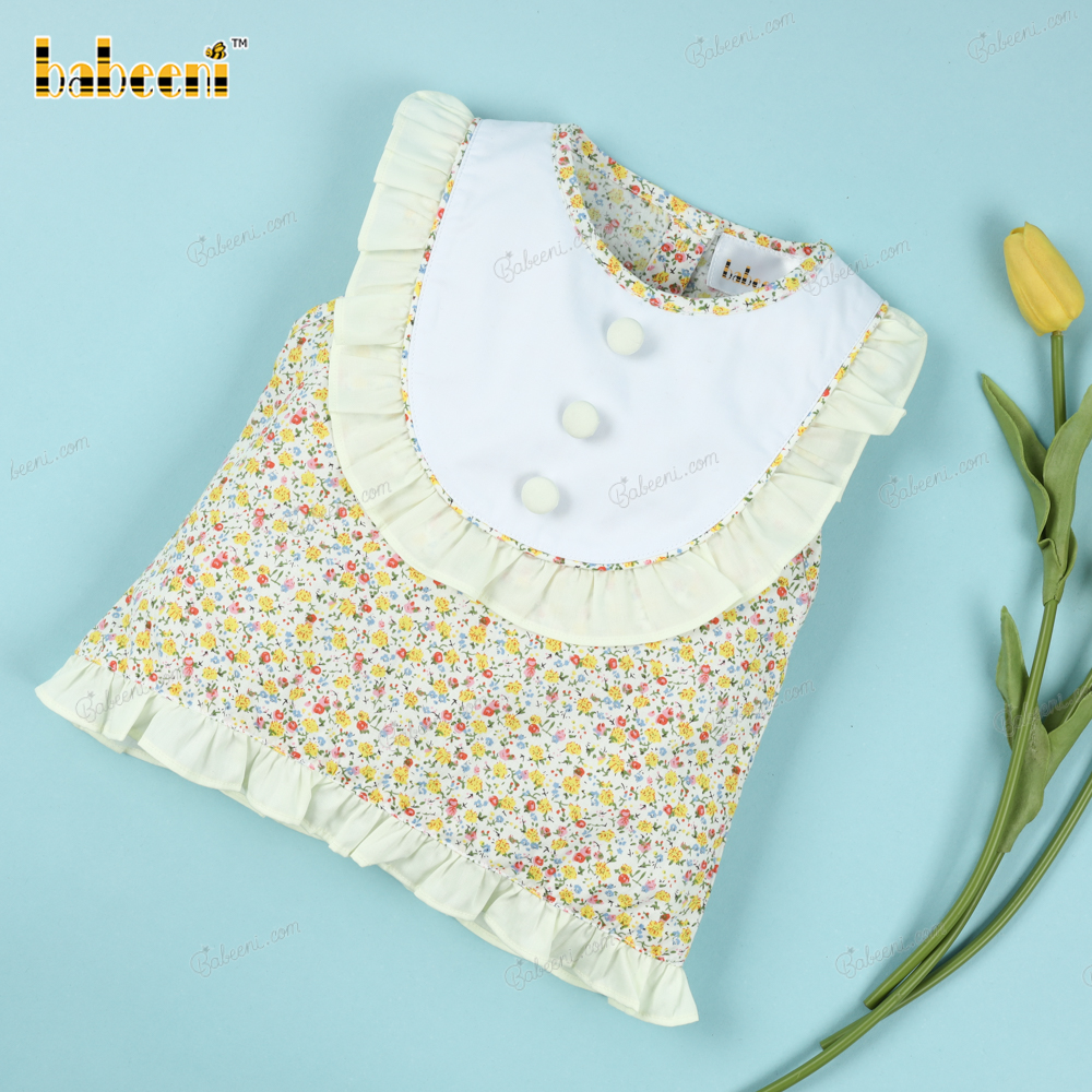 Feature: A lovely set for girls this summer. It comes with yellow tiny floral fabrics in a sleeveless style.
