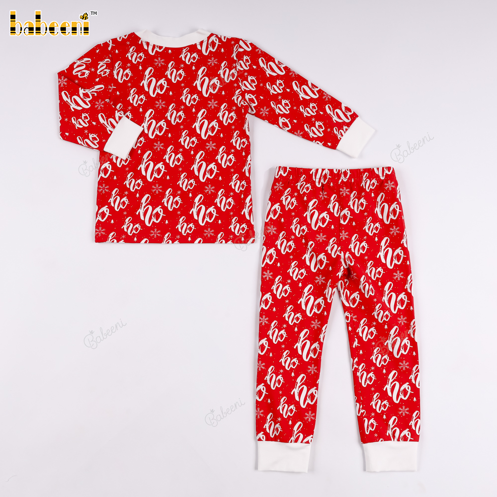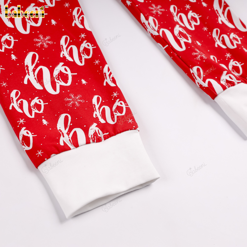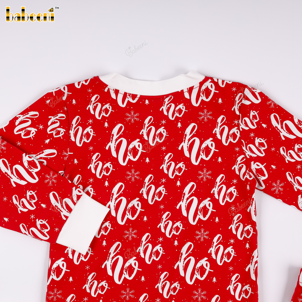 A red outfit with Christmas-themed pants and a hohoho print.– BB3577