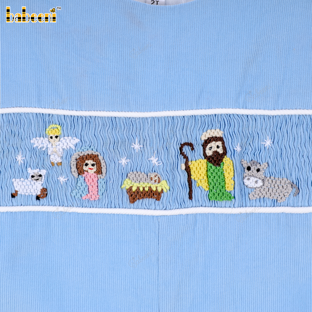 Features: Nice smocked longall for little boys with hand smocked Angel and Jesus on Christmas Night, covered buttons on shoulder. Perfect for Christmas. Best gifts for birthday or special days.