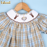 Feature: Baby girls smocked bishop featured with cute reindeers and mallard smocked pattern around the neck. Back buttons for easy dressing, zigzag at hem