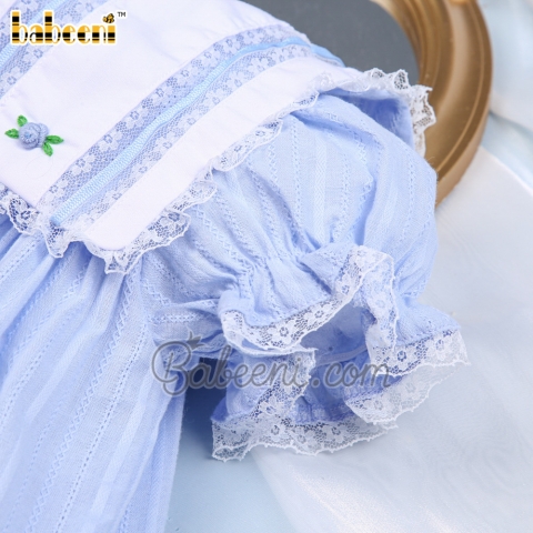 Feature: Little girl dress with hand-embroidered flower patterns, laces hem, zig zag and buttons at back for easy wearing, puff sleeves. It is suitable to wear in special occasions or holidays