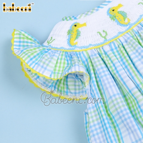 Feature: Beautiful smocked bishop dress for little girl with seahorse hand smocked patterns on the neck, short sleeves.