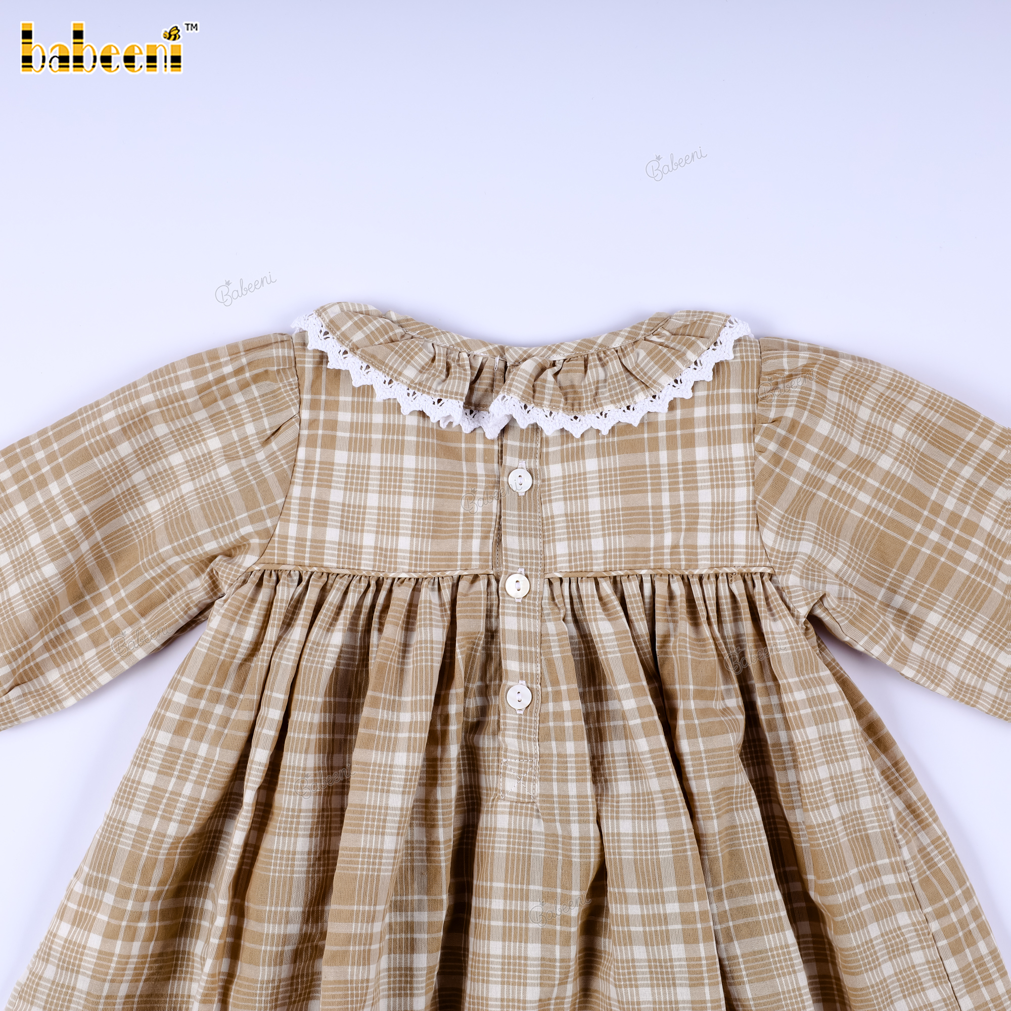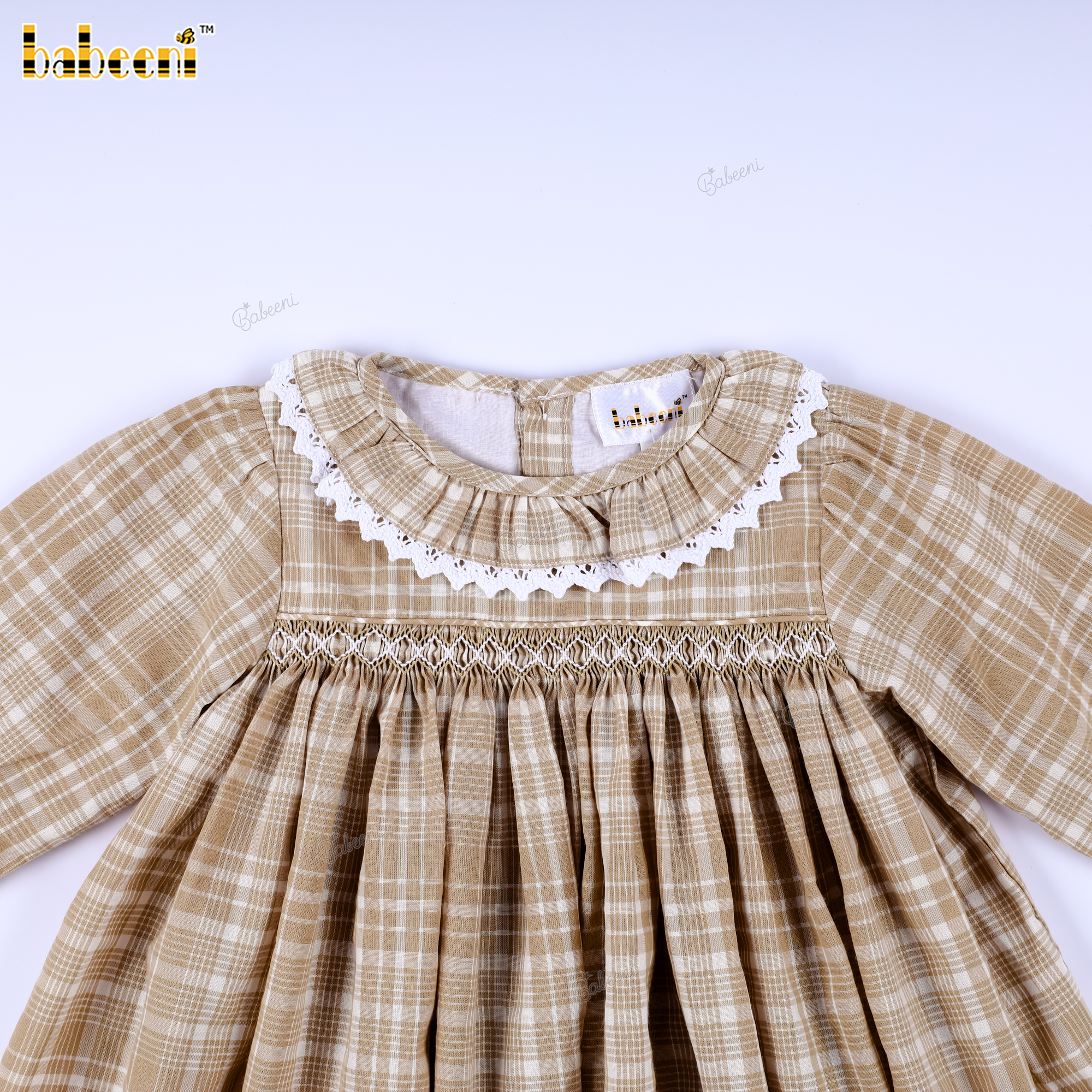 Beige Plaid Long-Sleeve Smocked Dress for Baby Girls- BB3590