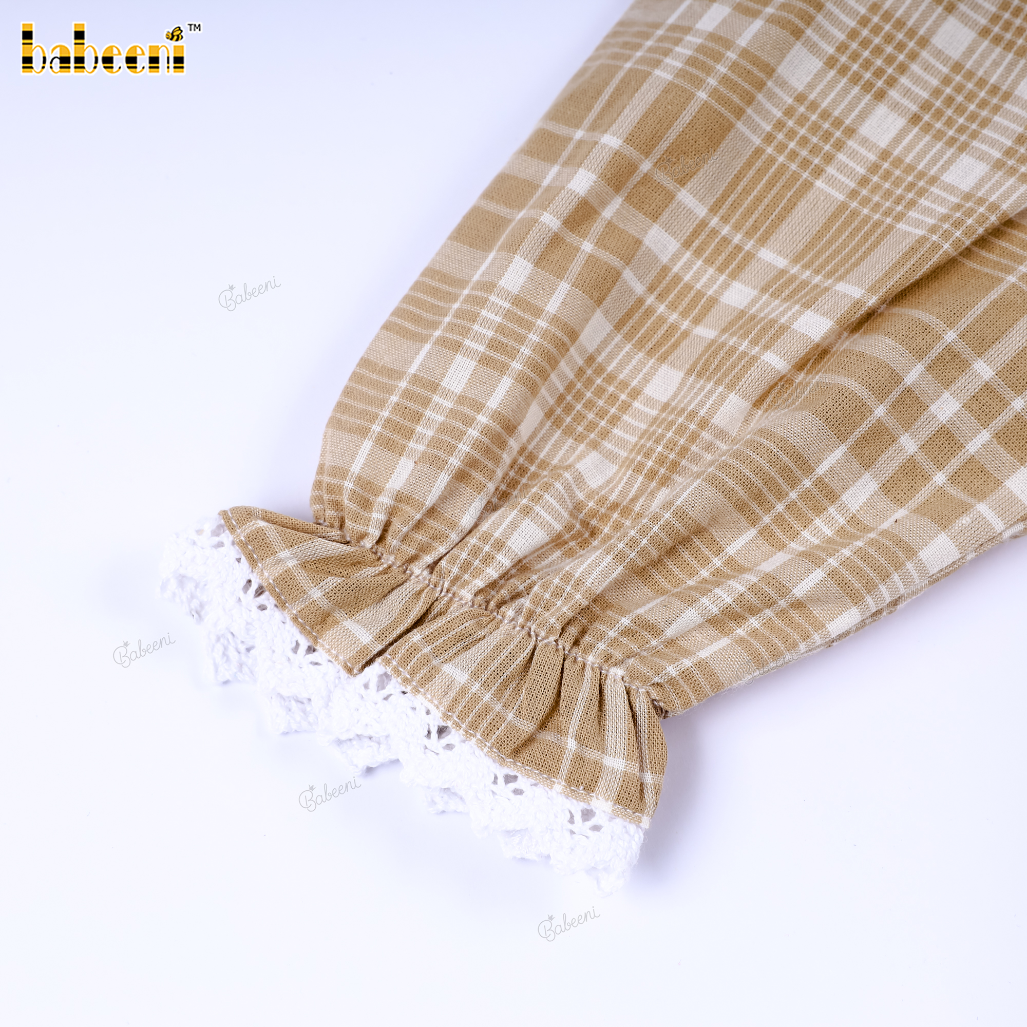 Material: Soft, breathable cotton blend in beige plaid with lace trim accents.