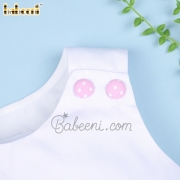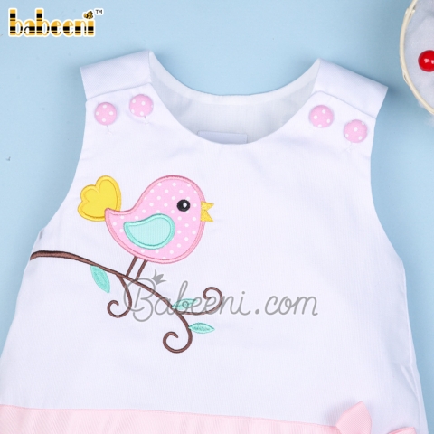 Feature: Nice sleeveless dress for little girl with bird applique pattern, shoulder buttons, lovely pink ribbon.