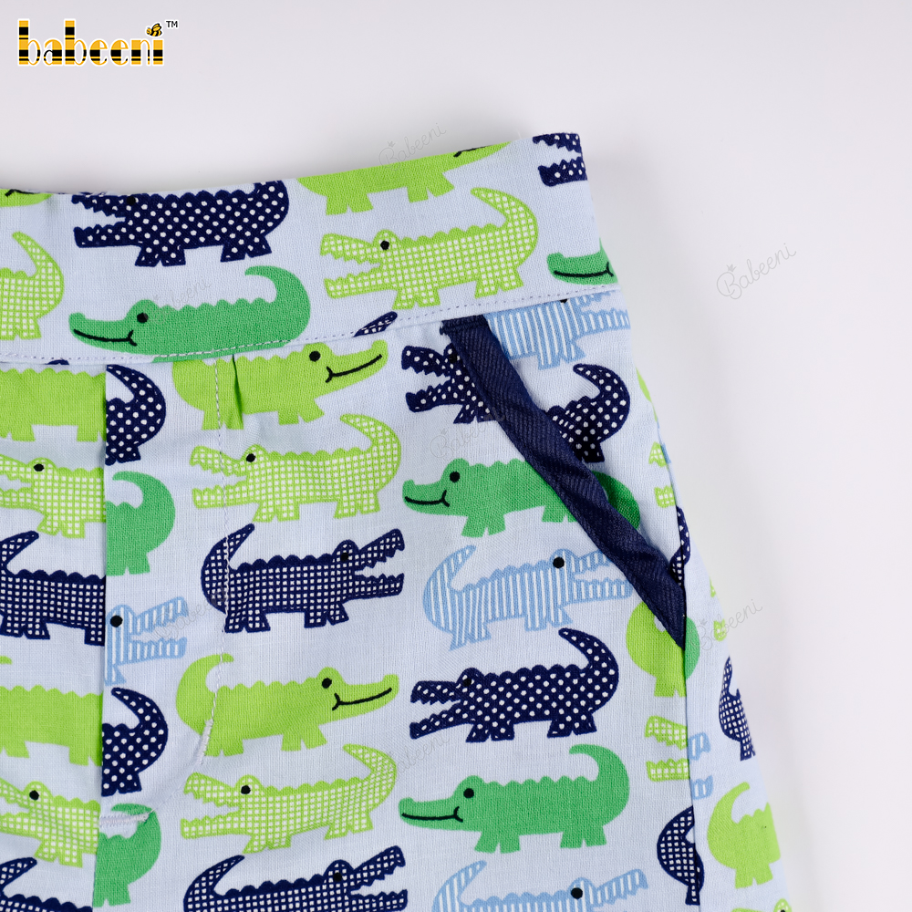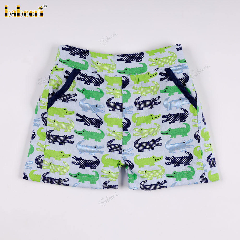 Feature: Boys' shorts featuring a fun crocodile print in a variety of bright green and blue colors. Designed with two convenient side pockets, these shorts create a dynamic, youthful, and vibrant style. Perfect for hot summer days, strolling around town, playing, or participating in outdoor activities.