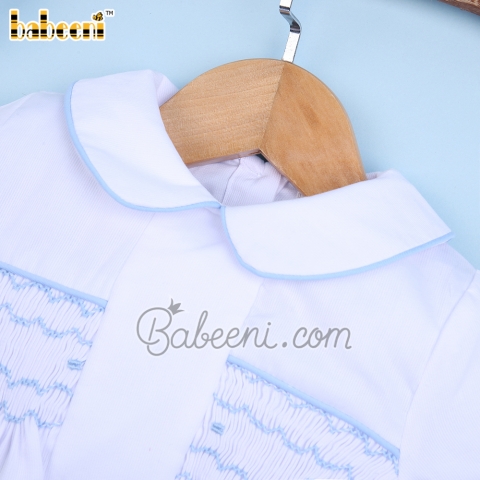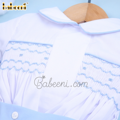 Feature: Boy geometric smocked set with geometric embroidery patterns on the chest. Buttons on back for easy dressing. Perfect combination between pattern & fabric.