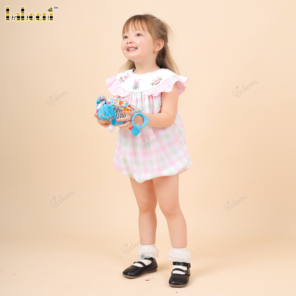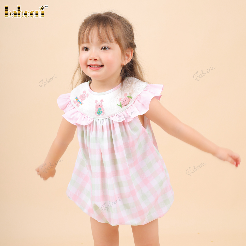 Feature: This bubble dress is in a lovely pink with three bunnies smocked on the front neck. This is a perfect gift for your girl this Easter season.