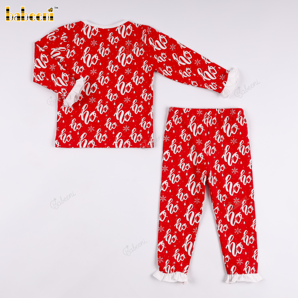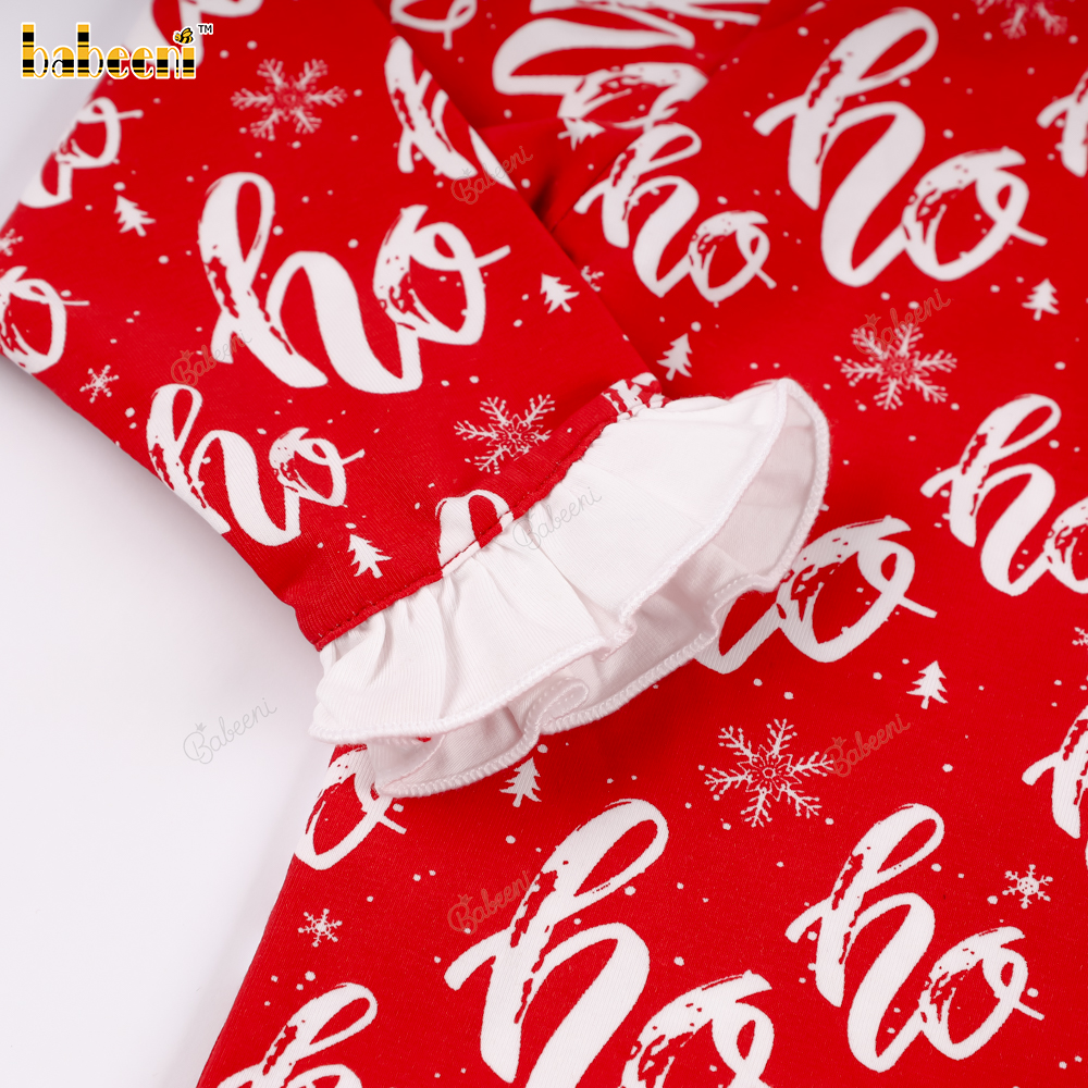 Christmas set with "Ho Ho Ho" pattern and ruffled trim..– BB3580