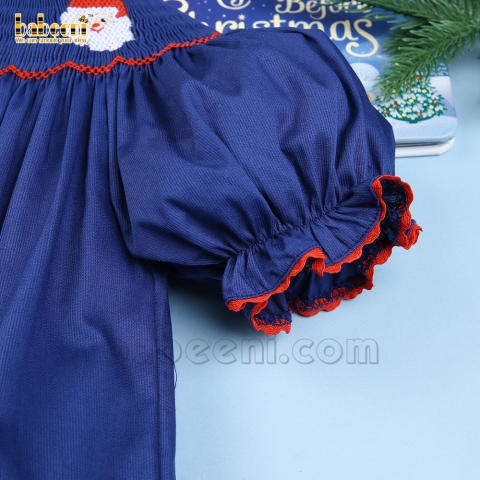 Feature:Pretty Christmas smocked dress in bishop style with Santa Claus hand smocked patterns around the neck, puff sleeves, back buttons.