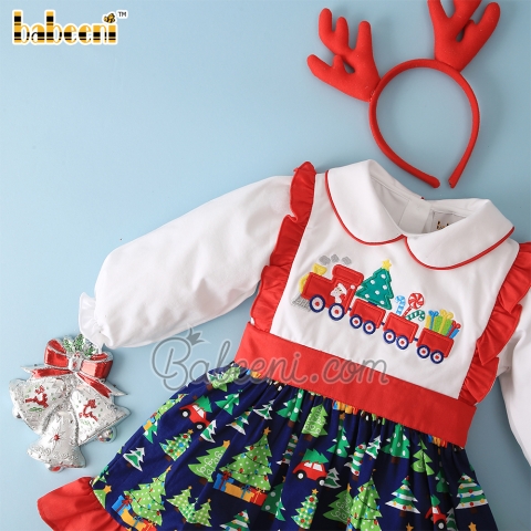 Feature: Beautiful girl set with Christmas train on the chest, sleeveless, embellished with lovely ruffle along both sides of dress & hem. Combining with white T-shirt is perfect.