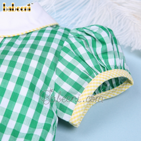 Feature: Girl dress for St. Patrick with clovers hand-embroidered pattern in the front, belt with buttons