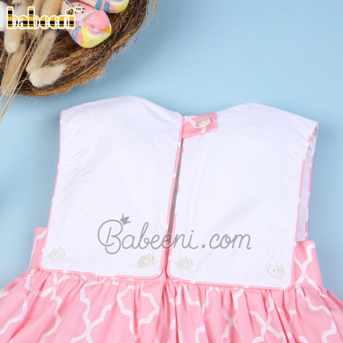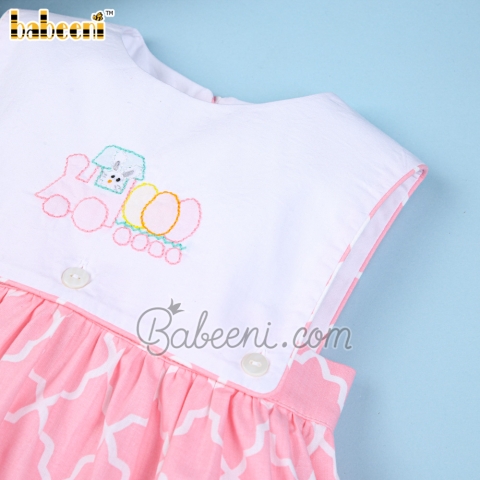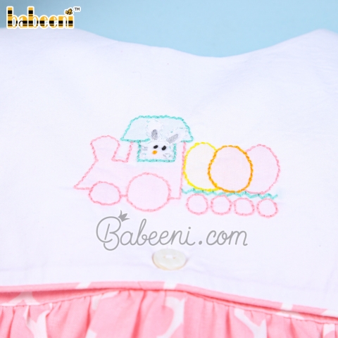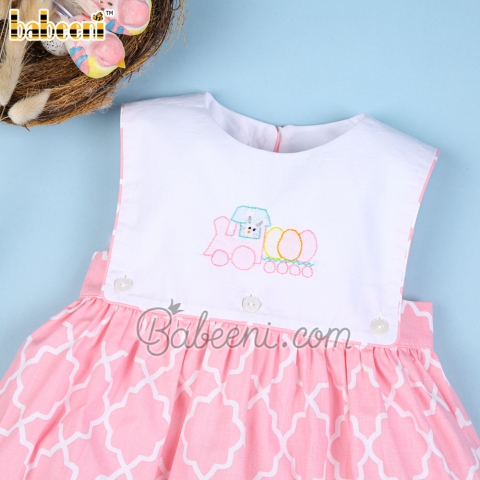 Feature: Lovely girl dress for Easter occasion with Bunny eggs train shadow embroidery pattern on large white rectangle bib, back buttons
