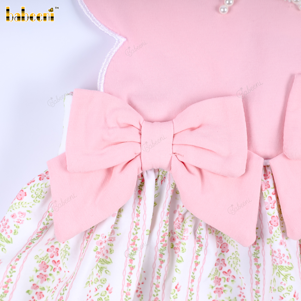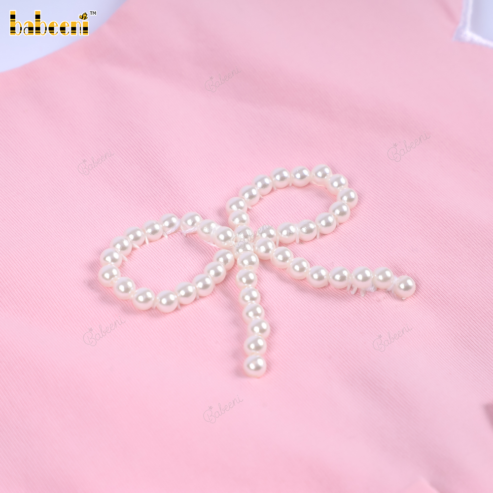 Feature: A lovely dress for babies with pearl embroidery and a white border around the hem, adorned with two bows on either side, making it very pretty and perfect. The best gift for birthdays or special occasions.