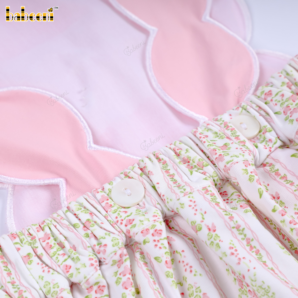 Material: Light pink fabric with pink striped floral print, eco-friendly, with white border and floral pattern.