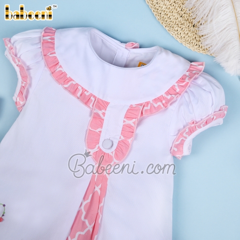 Feature: Beautiful A-line dress for little girl flowers embroidered front down patterns, short sleeves, ruffles on neck and top of sleeves. The dress' exquisite twist is pleat detail running along the body