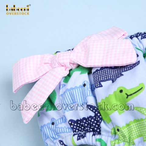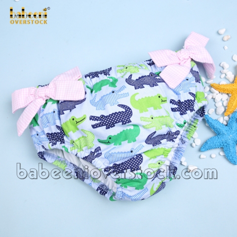 Feature : Cute two-piece bathing suit for girls with crocodile pattern , ruffles top, pink tie straps and pink bows on the waist