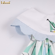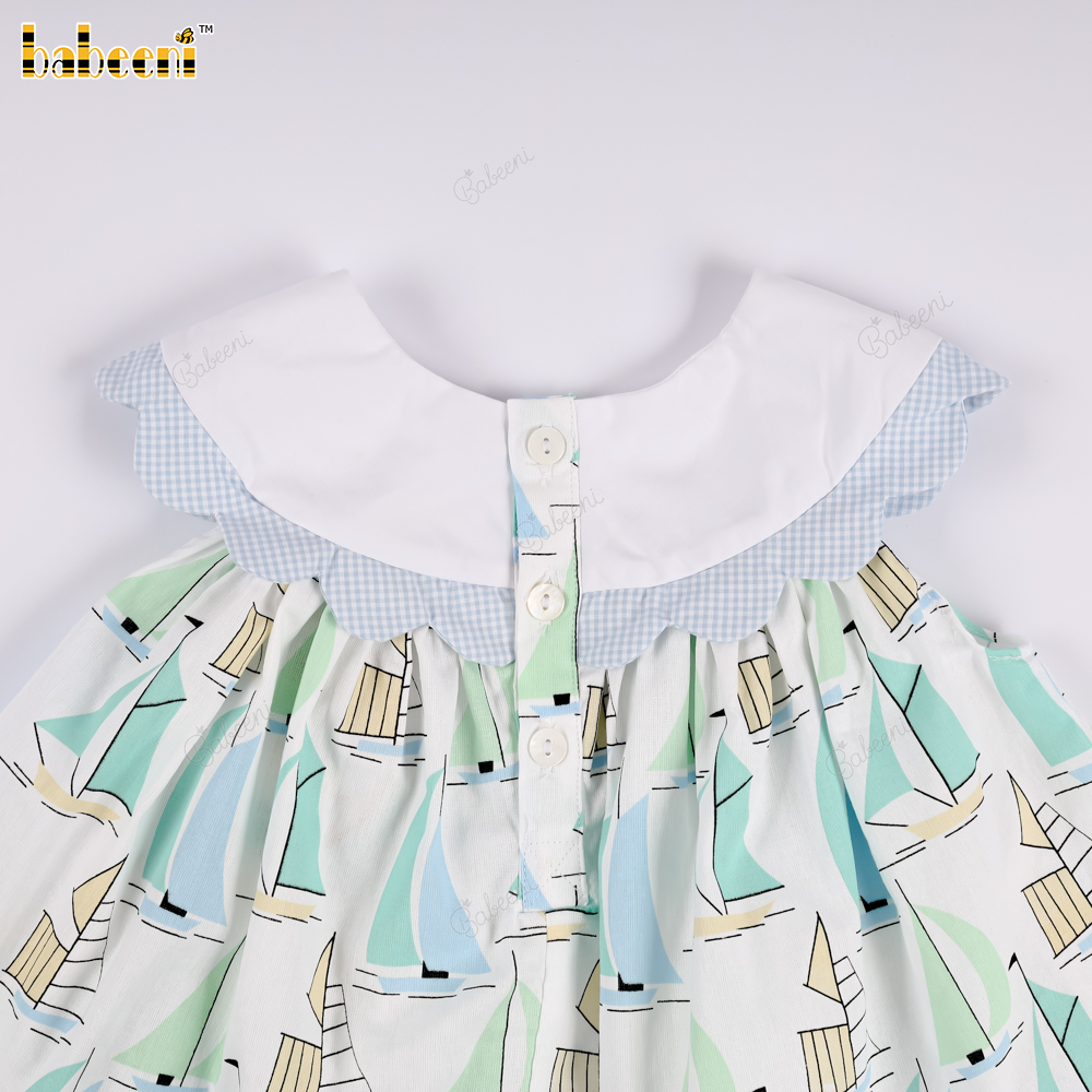 Feature: This girl's outfit boasts a fresh, summery style with adorable sailboat motifs on a soft white and light blue background. The delicate ruffled collar with subtle stripes adds an elegant touch, while the flared skirt allows for comfortable movement. Matching soft, elasticated bloomer pants are included, ensuring hygiene and adding to the cuteness. Suitable for outings, strolls, photoshoots, or everyday wear.