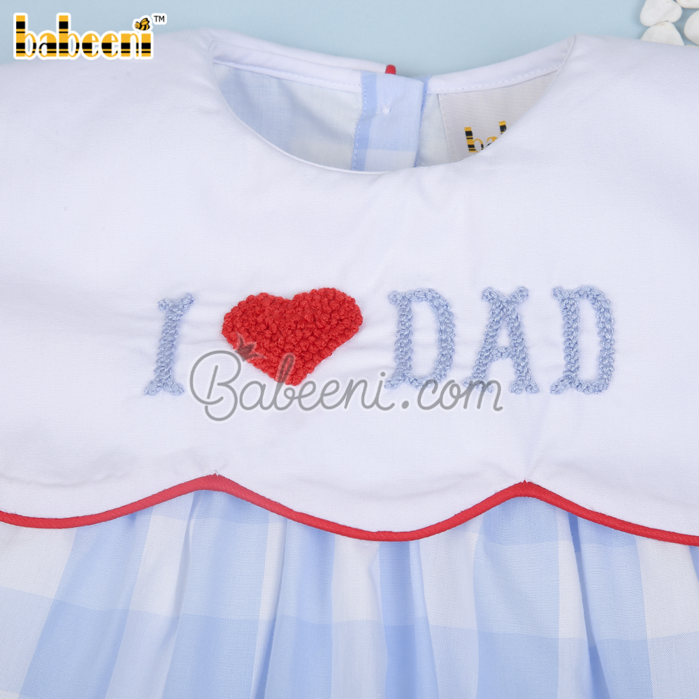 Features: Fancy baby bubble for little girls with embroidery of I love Dad on the chest, scallop around top, red hem around collar. Perfect for Spring summer. Best gifts for birthday or special days.