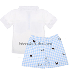 Feature:Nice outfit for little boy with labrador machine embroidery patterns on the chest pocket and on shorts.