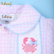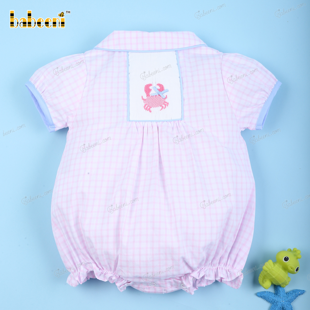 Feature: Beautiful baby bubble with crab hand-smocked patterns, short sleeves SS 2023 for girl collection. Perfect for summer and spring days.