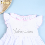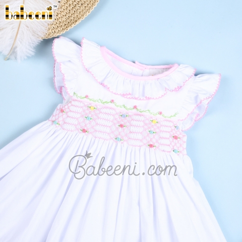Feature: Cute smocked dress for little girls with geometric hand-smocked patterns on the bodice, angel sleeves, ruffle at collar