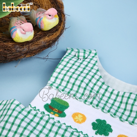 Feature: Lovely baby boy longall with St. Patrick day icons hand smocked pattern on the bodice, shoulder buttons, crotch snaps down to the stripe.