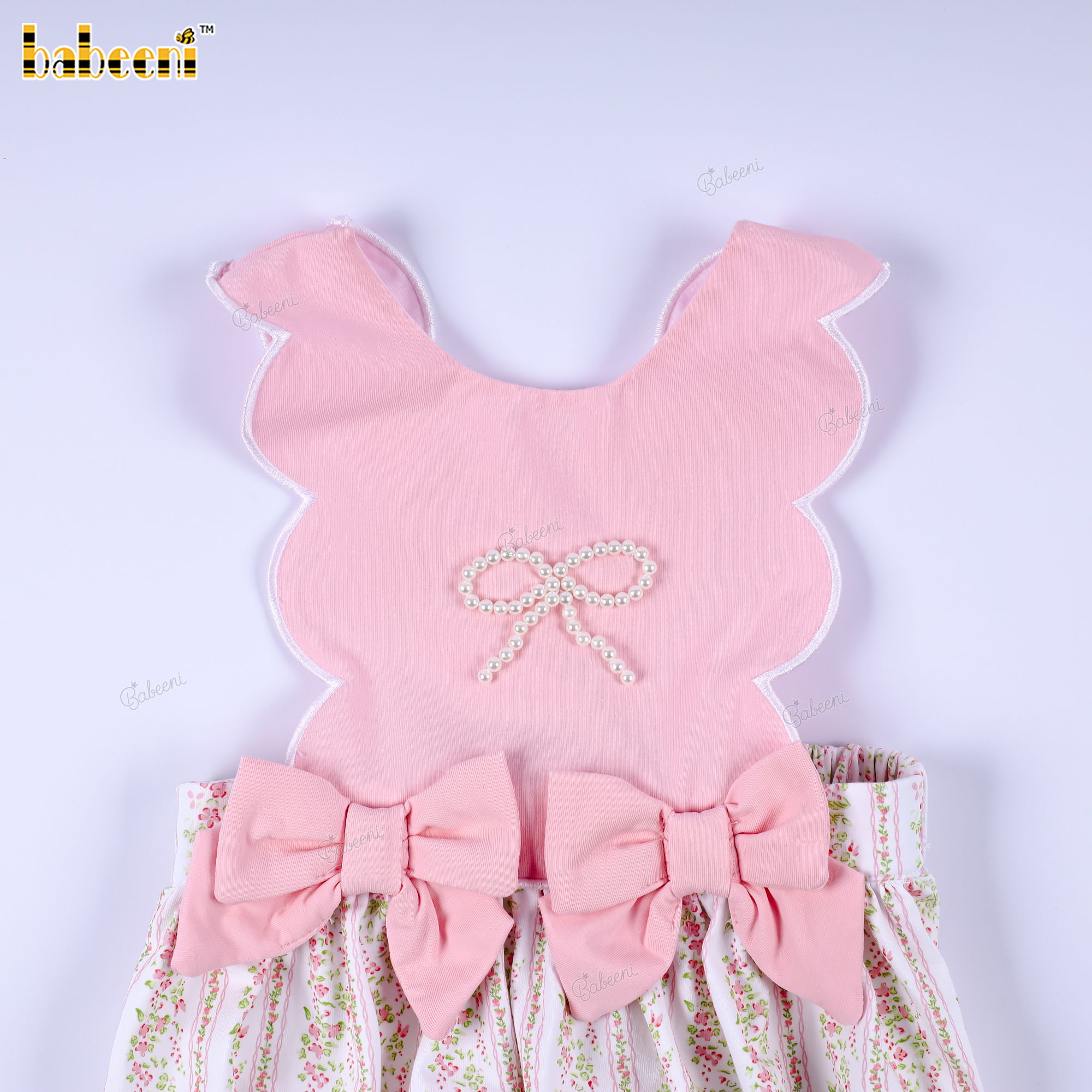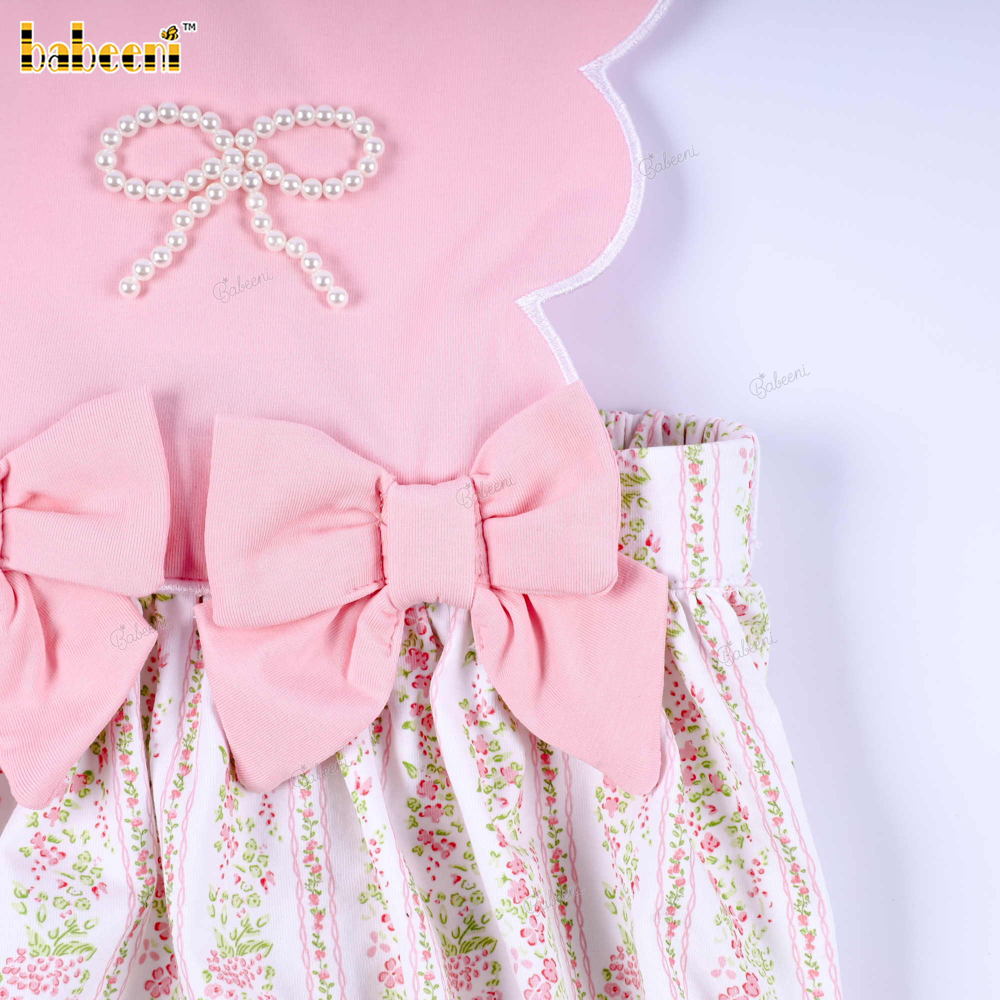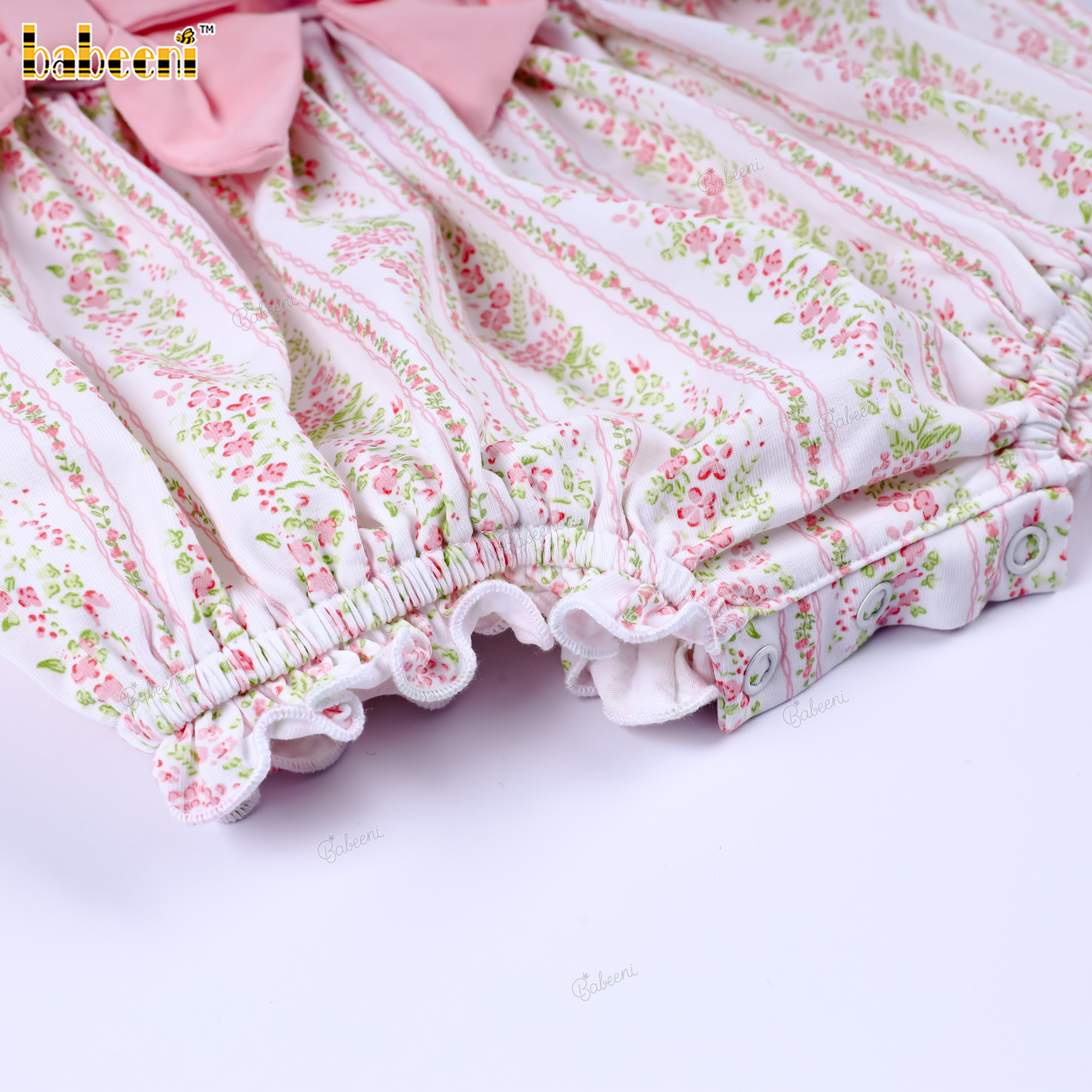 Feature: Adorable one-piece romper featuring a soft pink bodice with scalloped shoulder details and a delicate pearl bow embellishment on the chest. The bottom half showcases a floral striped bubble design with three matching pink bows at the waist. Elasticized leg openings provide comfort and easy movement for your little one. Perfect for casual outings or special occasions.