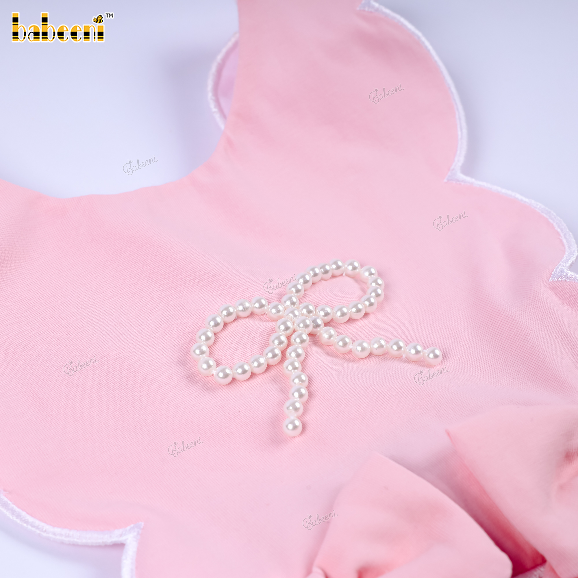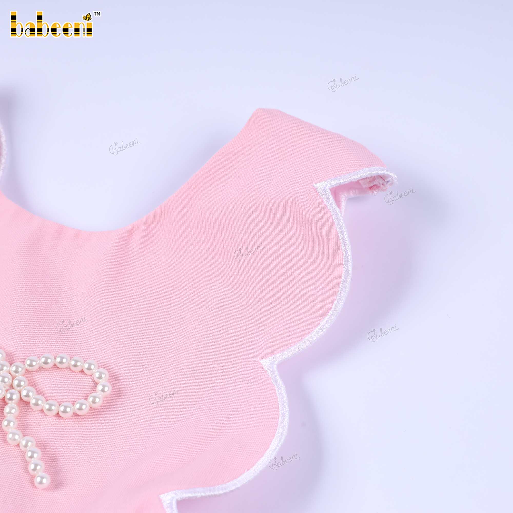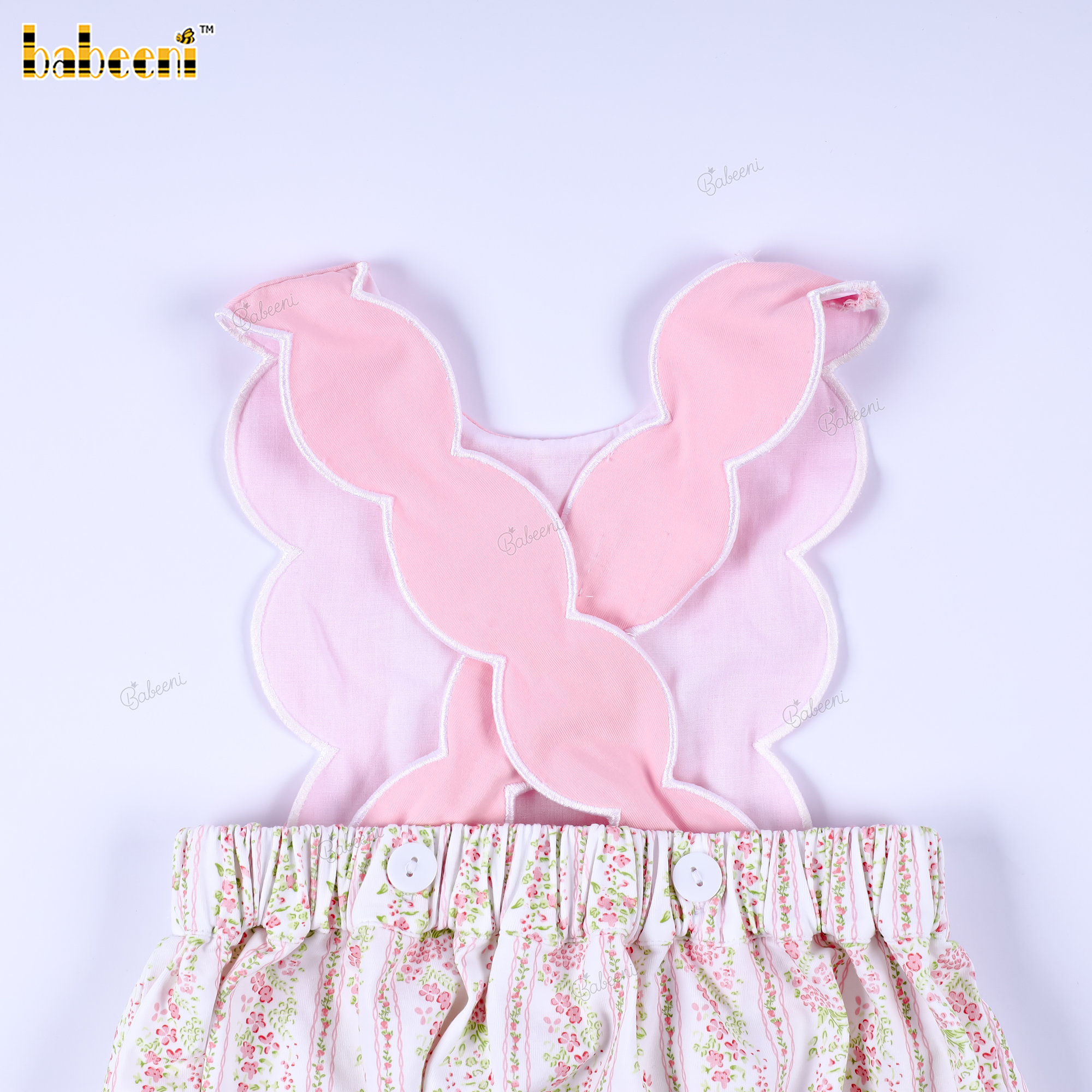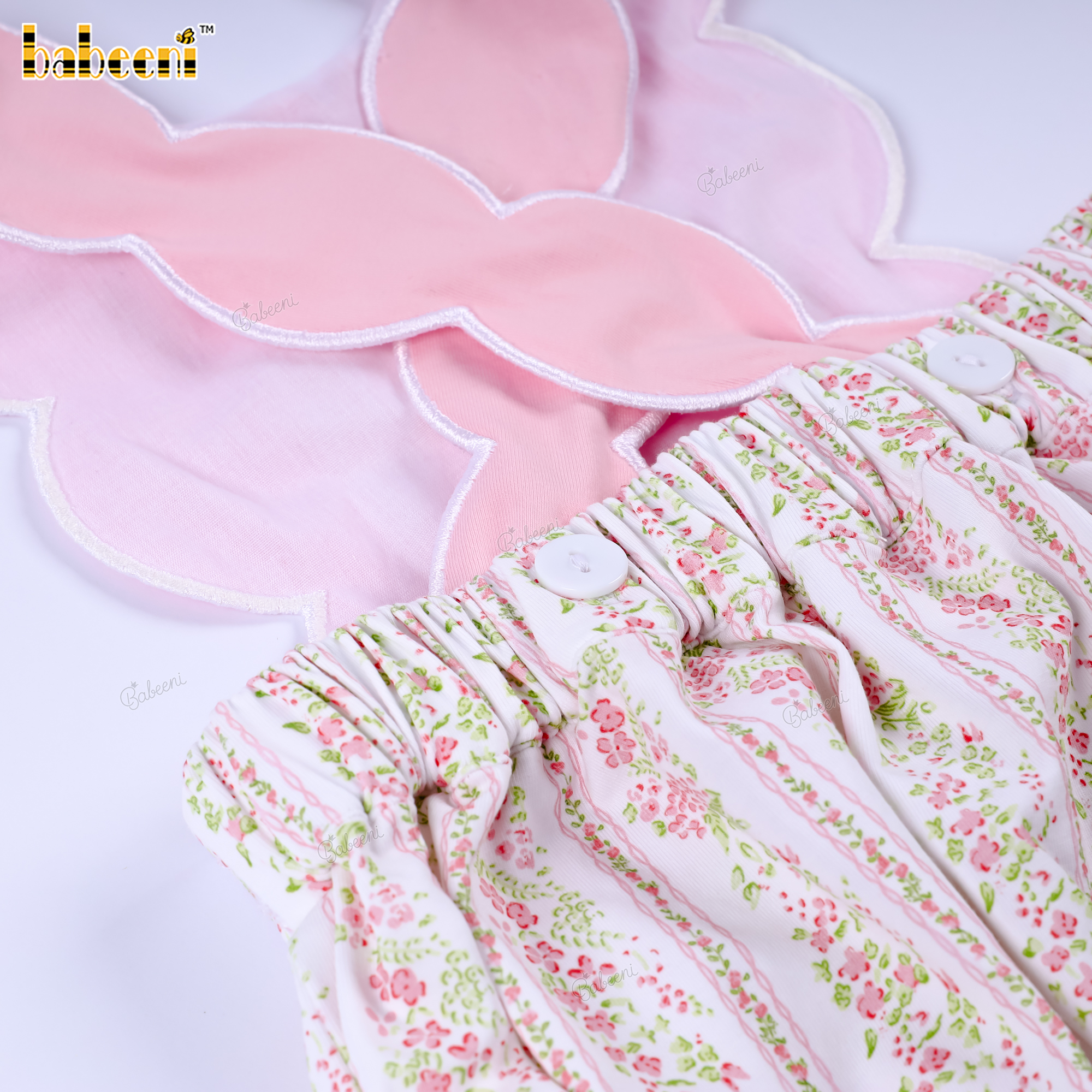 Feature: Adorable one-piece romper featuring a soft pink bodice with scalloped shoulder details and a delicate pearl bow embellishment on the chest. The bottom half showcases a floral striped bubble design with three matching pink bows at the waist. Elasticized leg openings provide comfort and easy movement for your little one. Perfect for casual outings or special occasions.