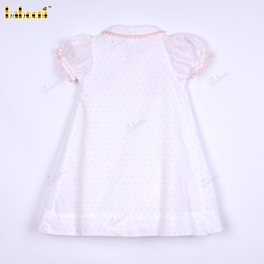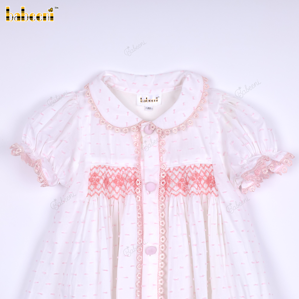 Features: White with pink swiss dot dress, hand smocked in pink and flower dotted, pink lace, covered buttons. Perfect for Spring summer. Best gifts for birthday or special days.