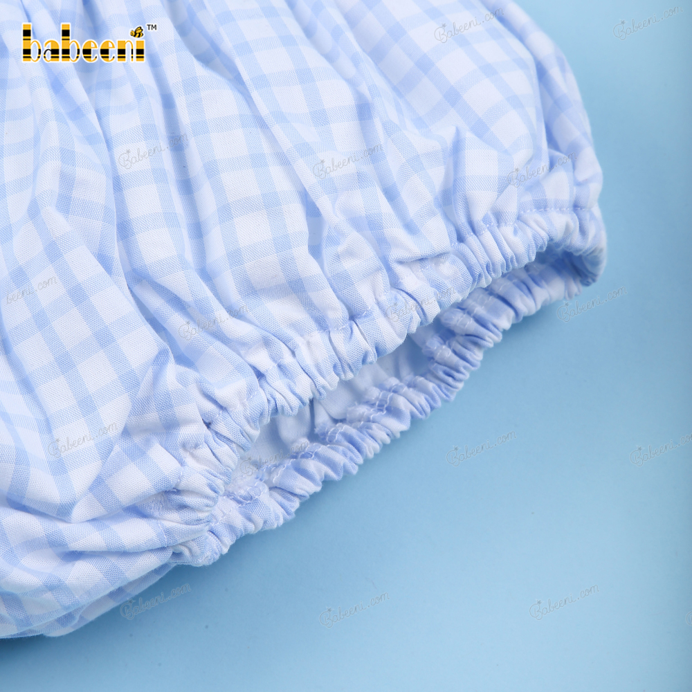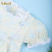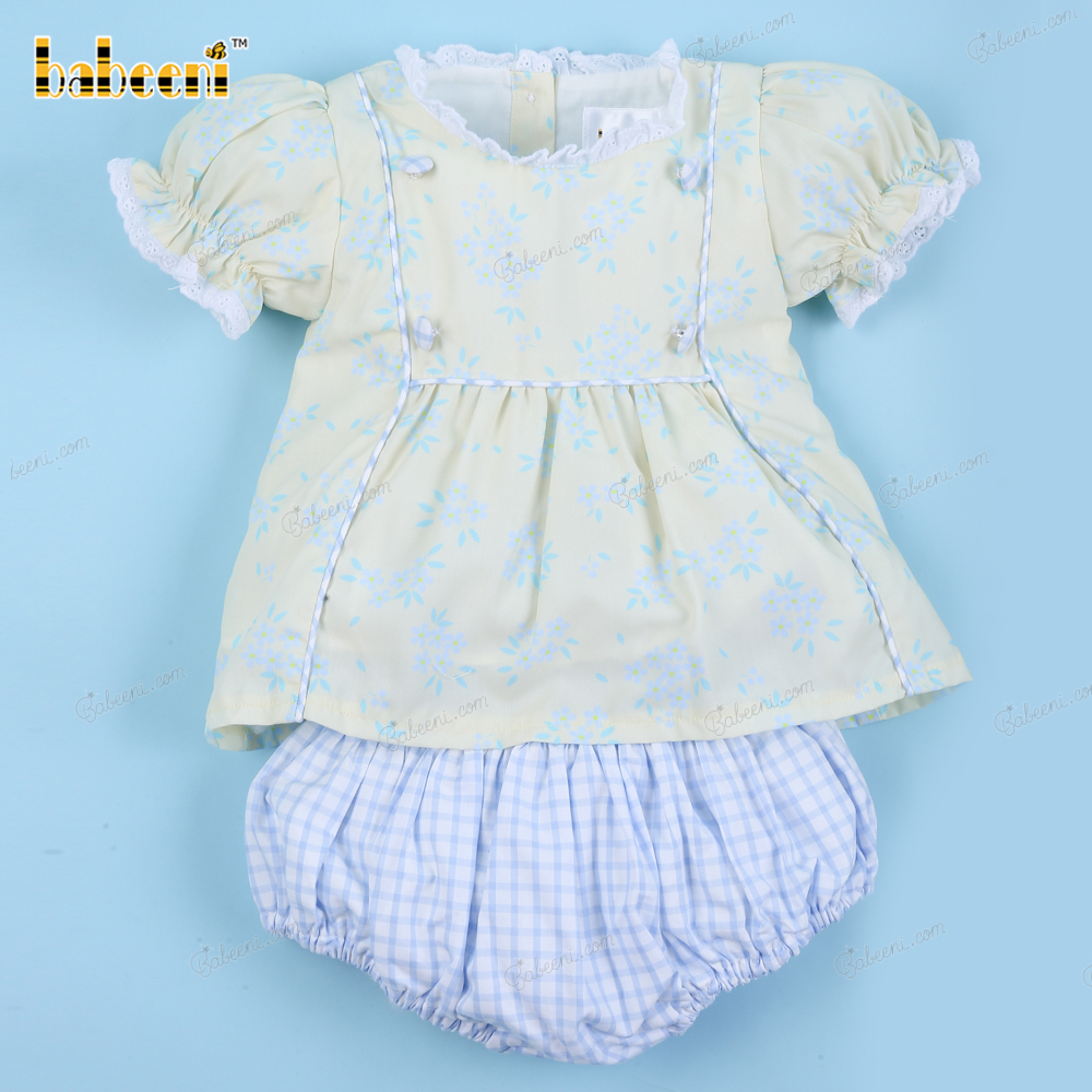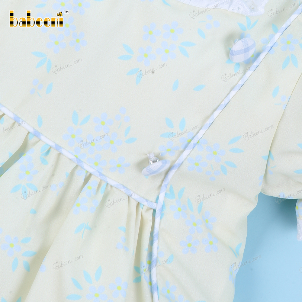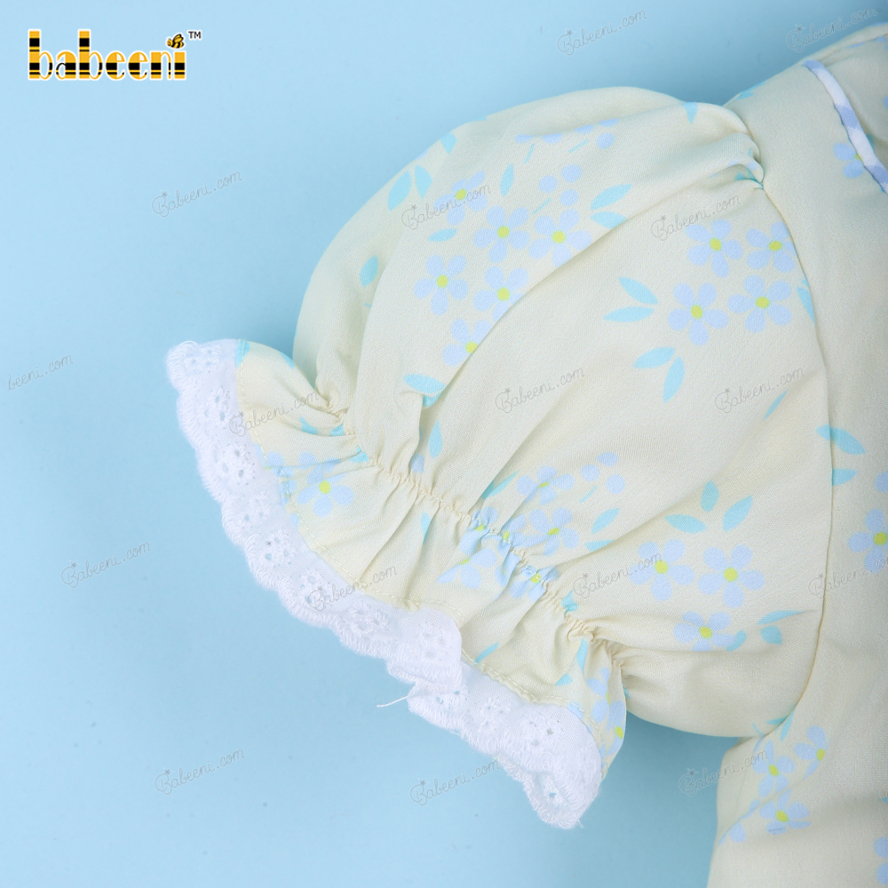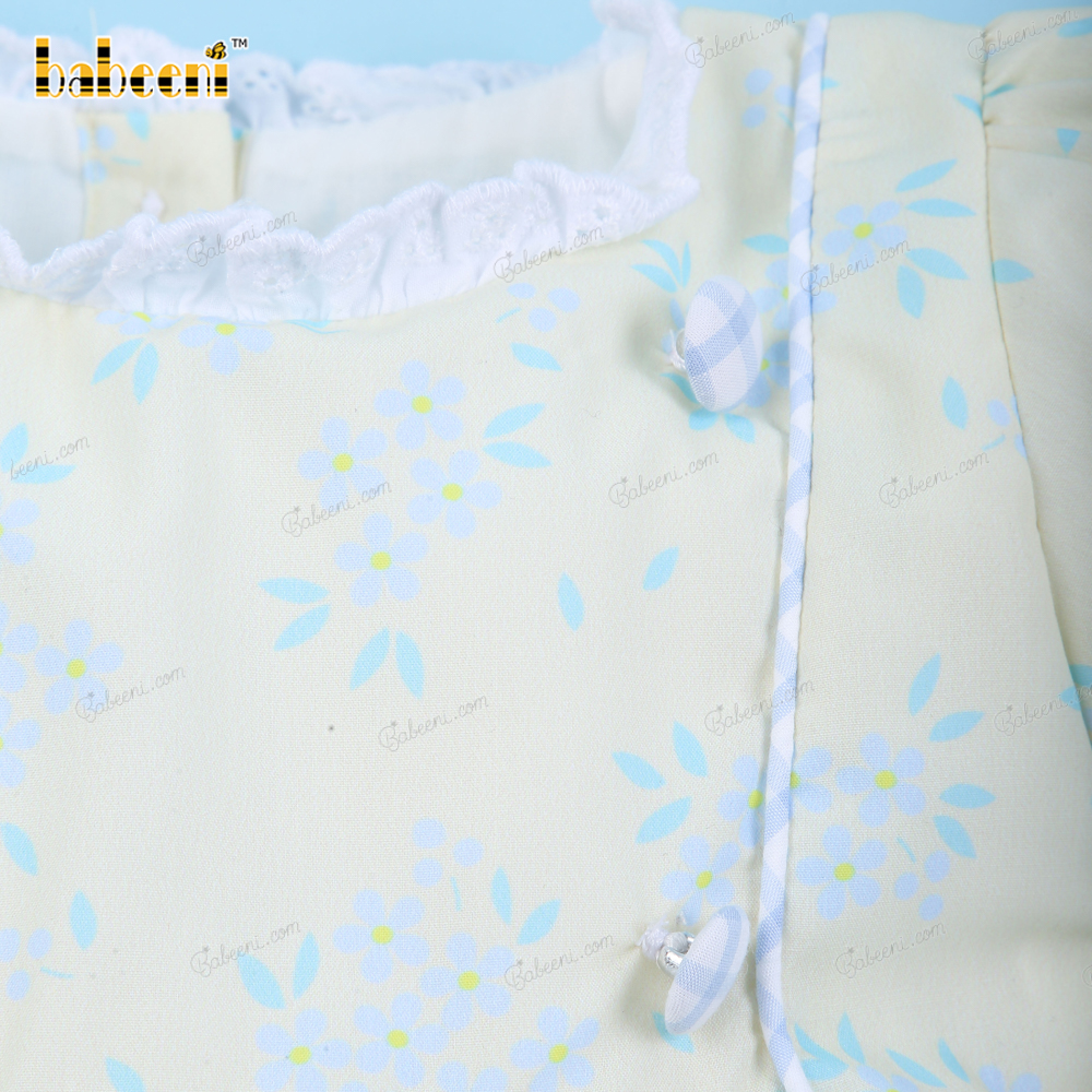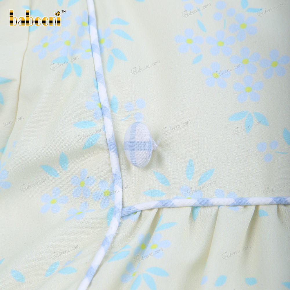 Feature: In our 2023 collection, this girl's short set with tiny blue flower printed patterns on the light yellow fabric, sleeveless and blue button on the front. Best suited for the girl in this spring and summer.