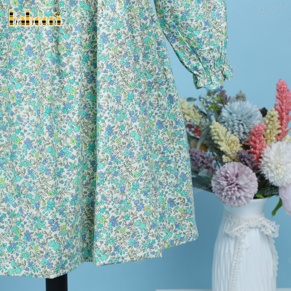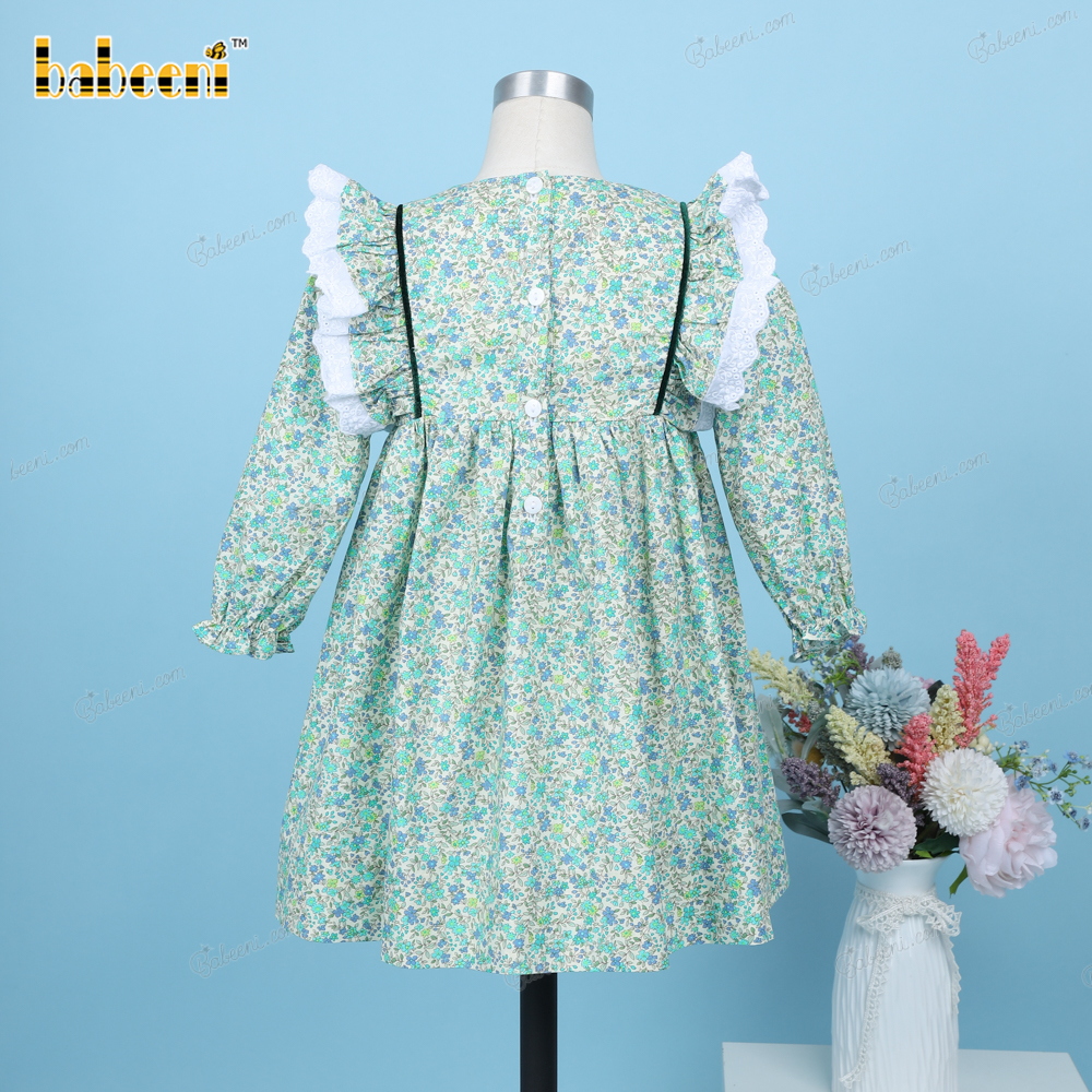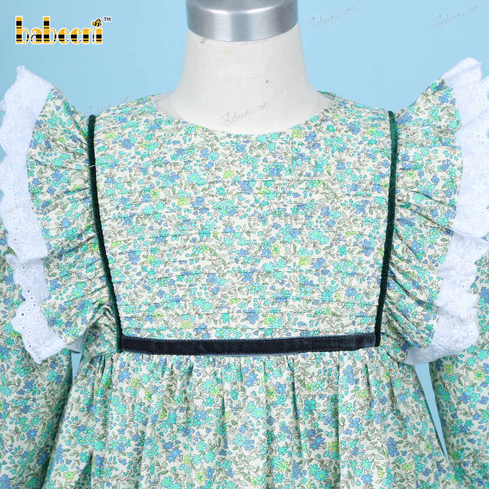 Feature: Green floral dress with cute butterfly neck and mallard green accent for your baby girl.