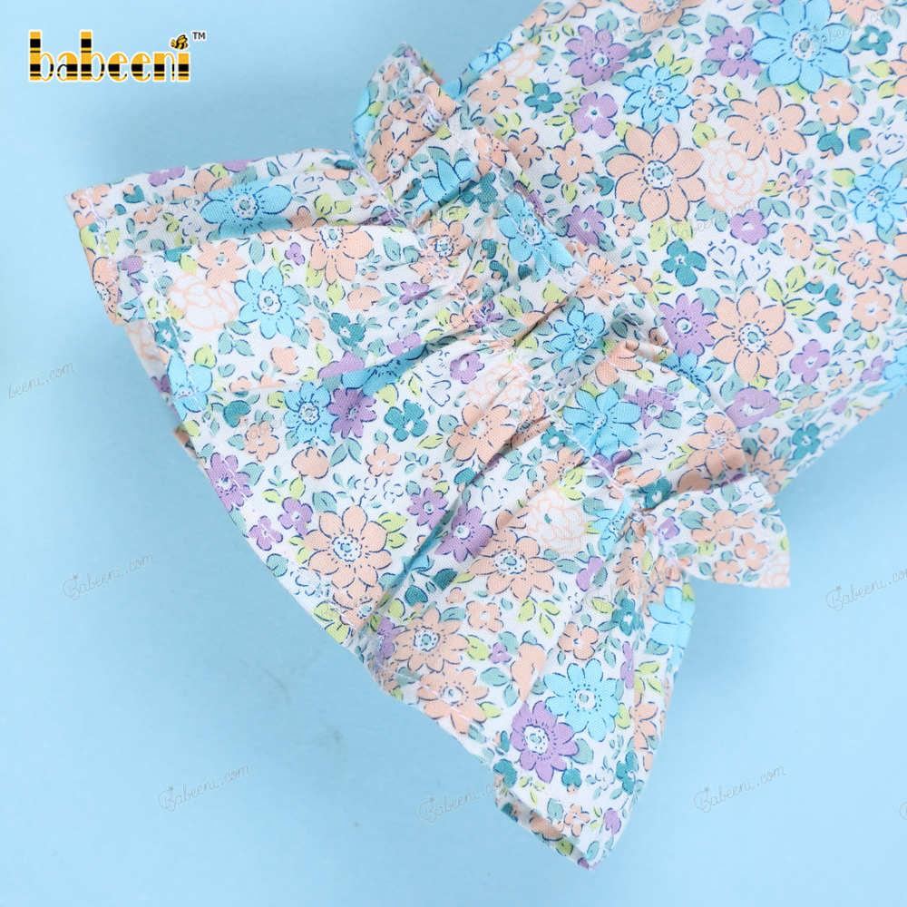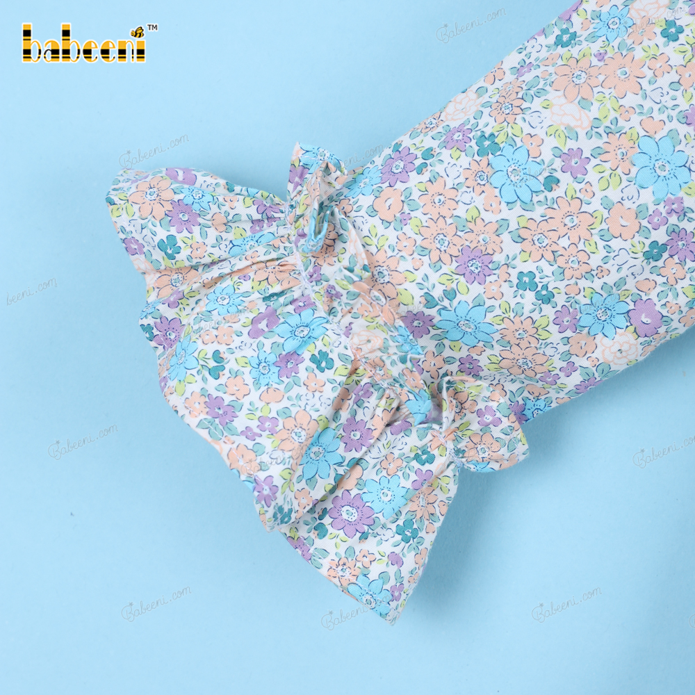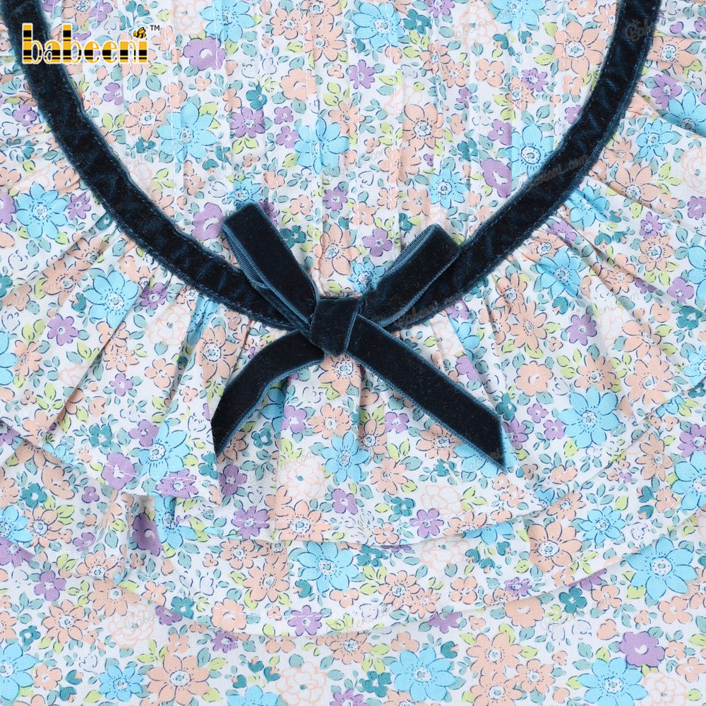 Feature: Girl shirt floral green Mallard green accent line around the neck.