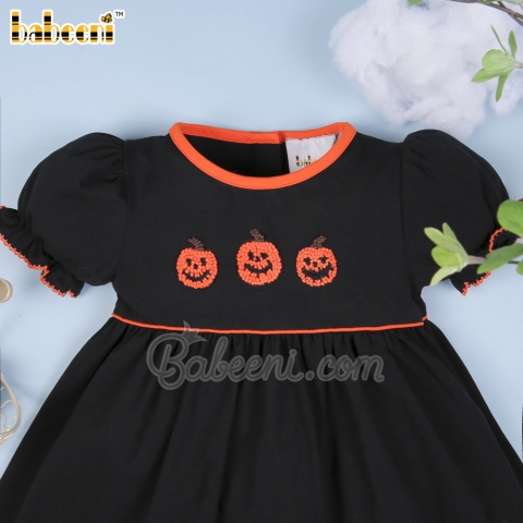 Features: Lovely Halloween dress with pumpkin French knot embroidery on the chest, orange neck & ruffle at hem of dress, orange thread zigzag on sleeves. Perfect for Halloween. Best gifts for birthday or special days.