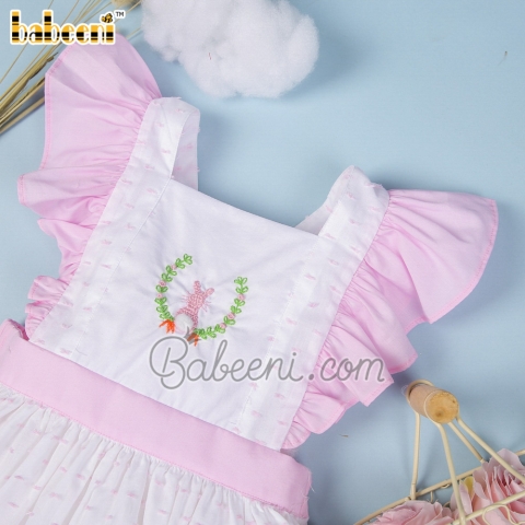 Features: Lovely baby dress for little girls with hand crochet of rabbit & hand embroidery of flowers, pink angel sleeves, ruffle on bottom. Best gifts for Easter or special days.