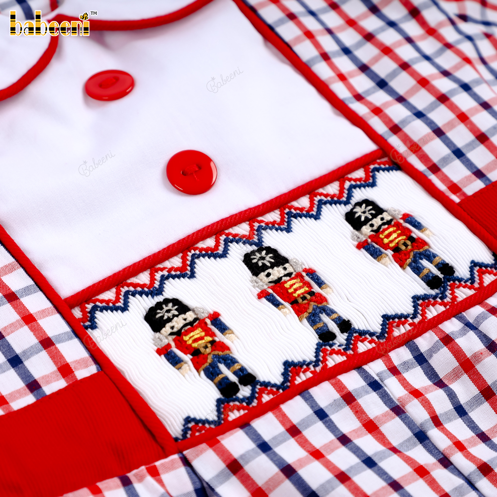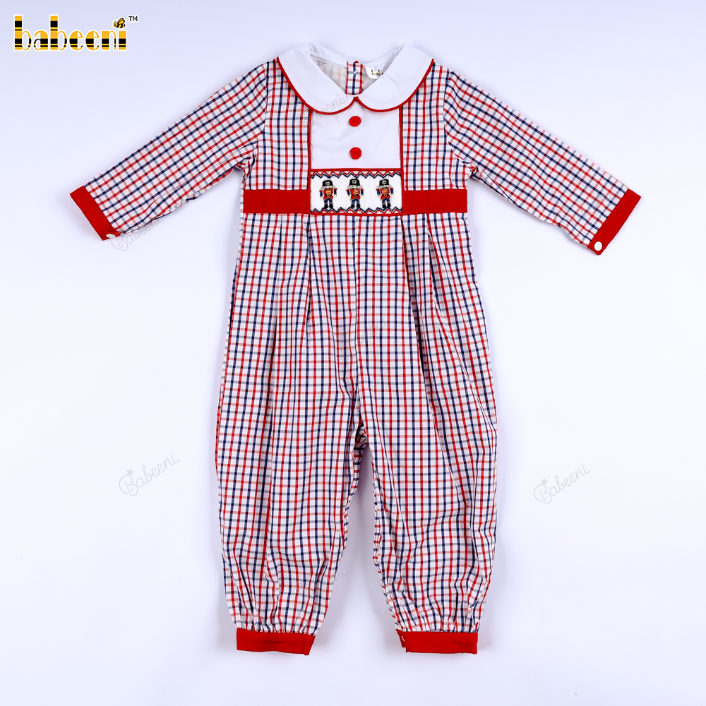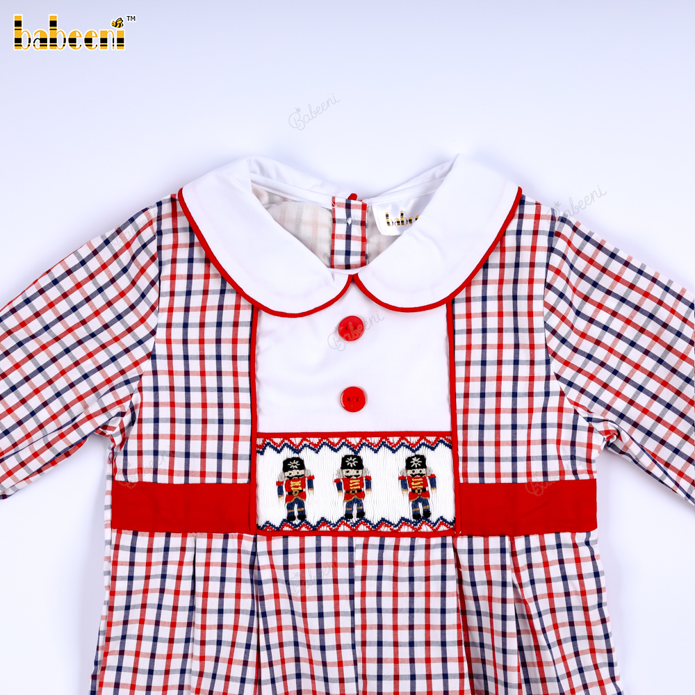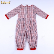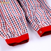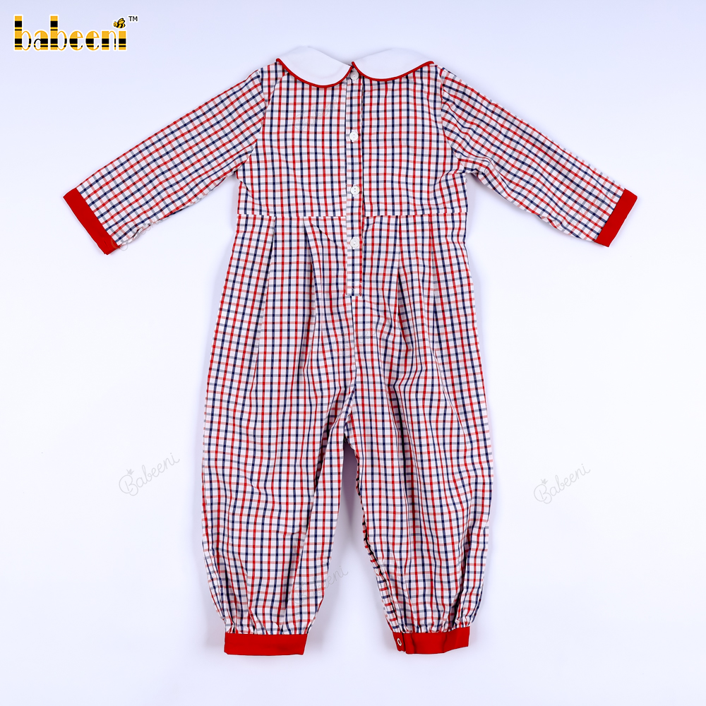 Features: Red and navy windowpane bubble for little boy with a rectangle hand smocked, long sleeves, peter pan collar. Perfect for Fall- Winter, Christmas. Best gifts for birthday or special days.