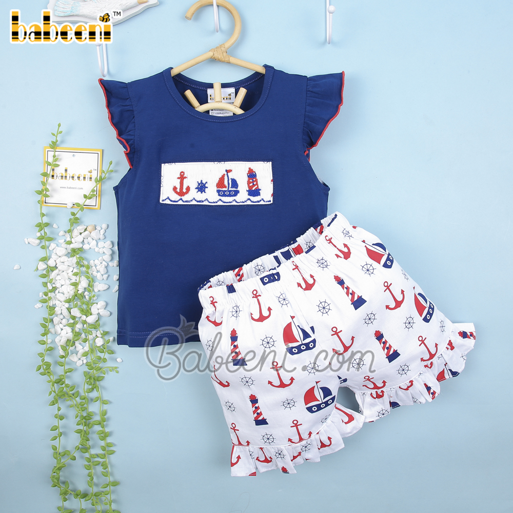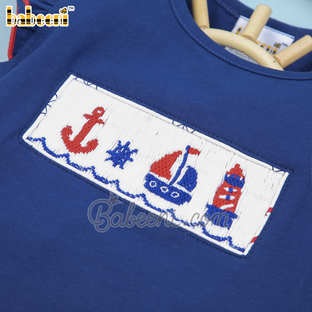 Feature:Nice outfit for little girl with sailboat, anchor, lighthouse and ship wheel hand smocked patterns, angel sleeves, round neck