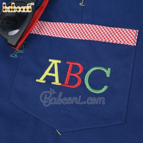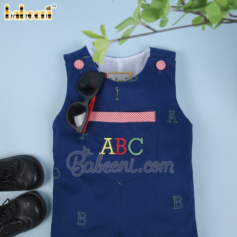 Feature: Cute Shortall for boy with a pocket ahead which is with embroidered letters ABC. Snap buttons on the shoulder.Easy to mix with a shirt or T-shirt.