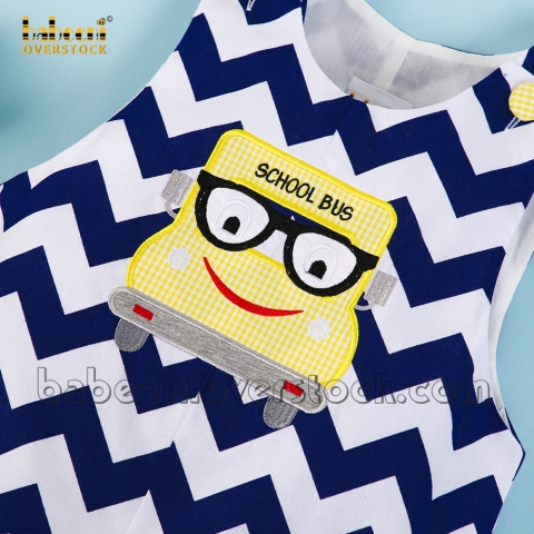 Feature: Lovely boy jon jon with School bus applique on the chest, buttons on the shoulder