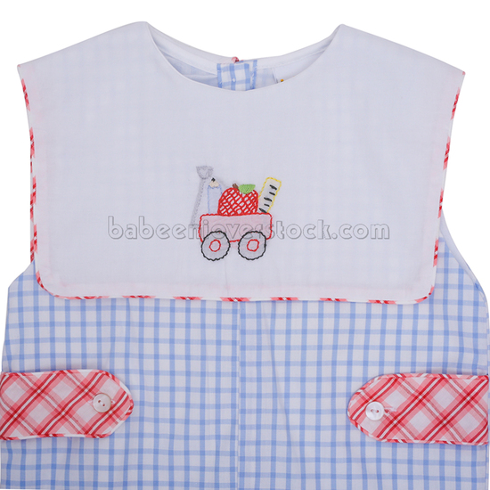 Feature:Nice boy shortall for back to school with school stationery hand embroidered patterns on large square collar. Crotch snaps.