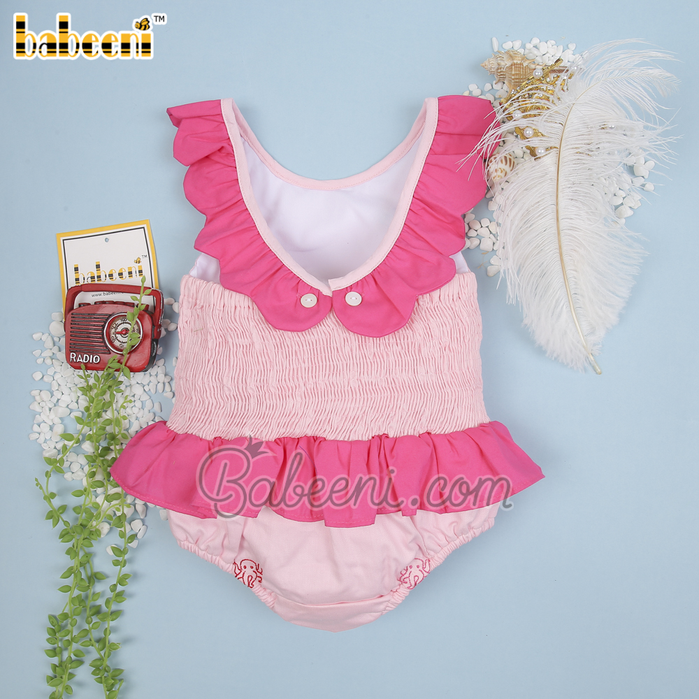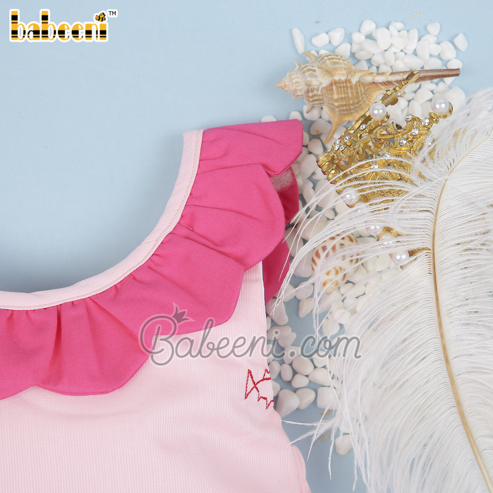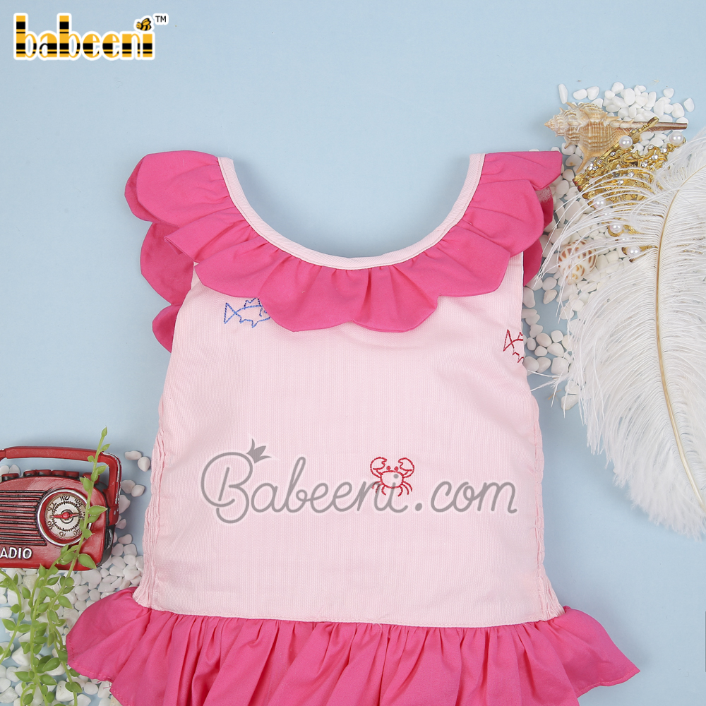 Feature:Pretty swimsuit for little girl with crab, fish and octopus machine embroidery patterns, elastic waistband
