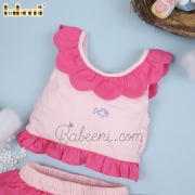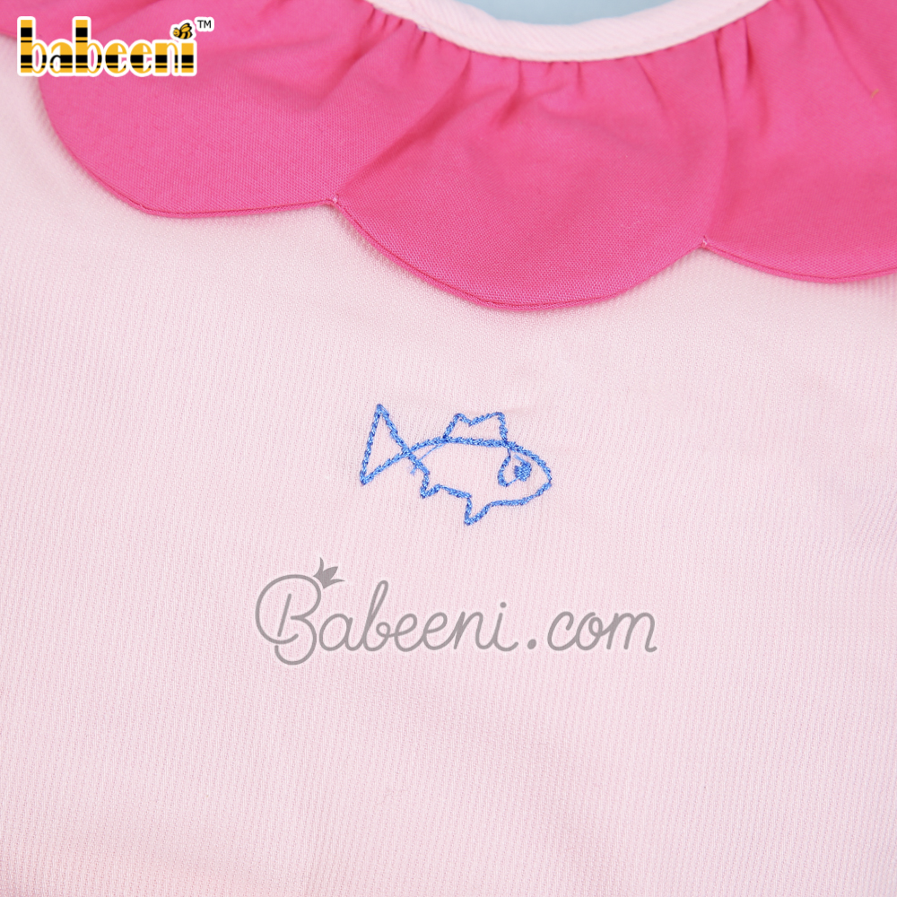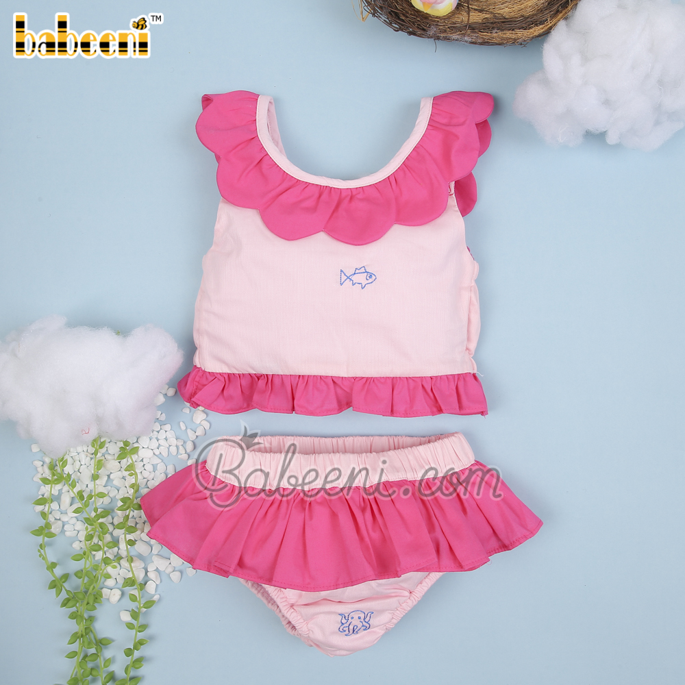 Feature:Pretty two piece swimwear for little girl with crab, fish and octopus machine embroidery patterns, elastic waistband