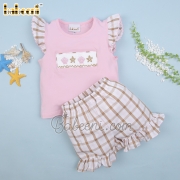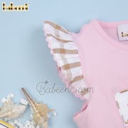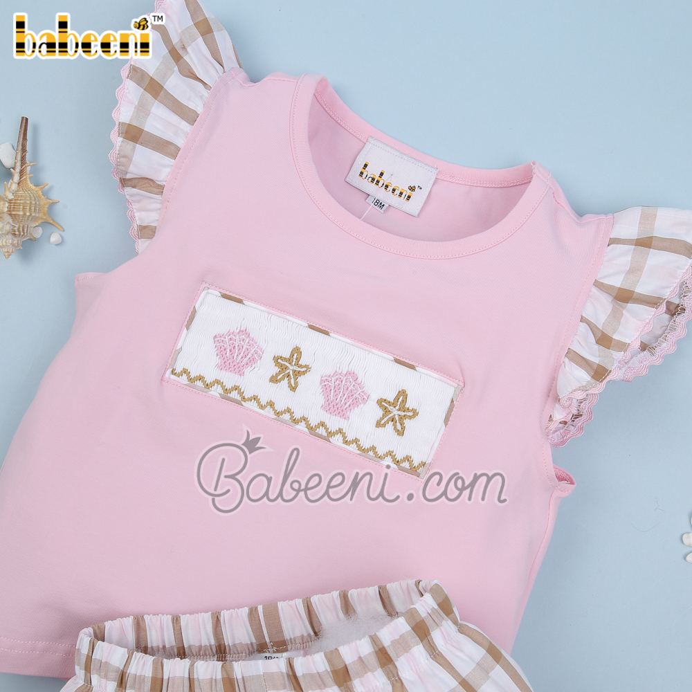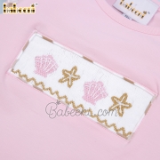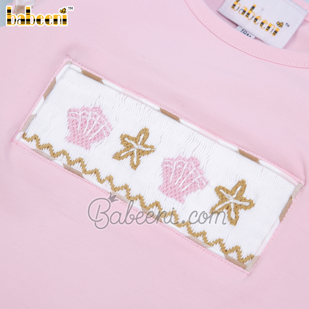 Feature: Cute girl clothing set with sea creature of starfish and seashell hand smocked patterns on the top, angel sleeves, bottom ruffles.