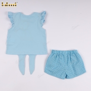 Feature: This summery outfit features a light blue t-shirt with an eye-catching embroidered sailboat design. The sleeves are designed with pretty ruffles, adding a feminine and cute touch. The blue checkered shorts, with delicate wooden buttons on the sides, create a look that is both energetic and elegant. Perfect for outings, walks, or birthday parties.