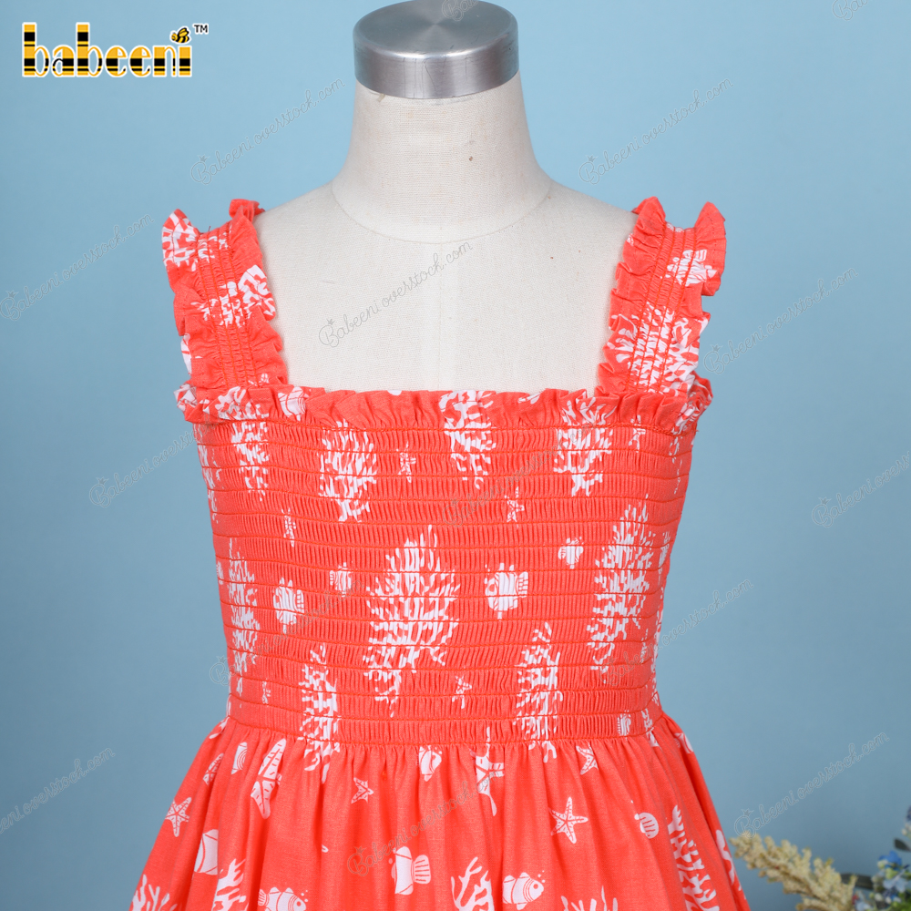 Features: An orange with white corals dress and a Shirred runs along the chest. Your little princess can wear this dress this spring and summer.
