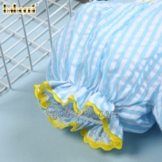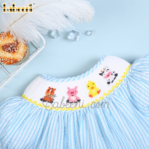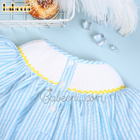 Feature: Nice smocked bubble for little girl with smocked animals around neck, yellow zigzag on sleeves. It is suitable for summer vacation. Best gifts for birthday or special days.
