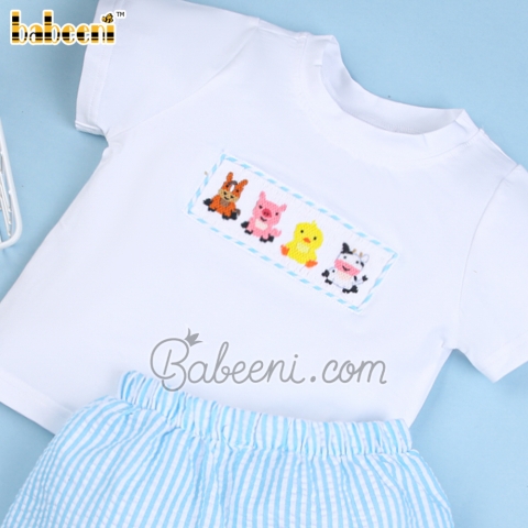 Feature: Nice clothing set for little boy with smocked animals on the chest. With perfect combination of white knit and aqua stripe fabric, the set is suitable for summer vacation.