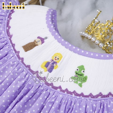 Feature:Beautiful bishop dress for little girl with smocked lighthouse, princess & frog on the chest, angel sleeves, white zigzag on sleeves & hem of dress. It is suitable for summer vacation.