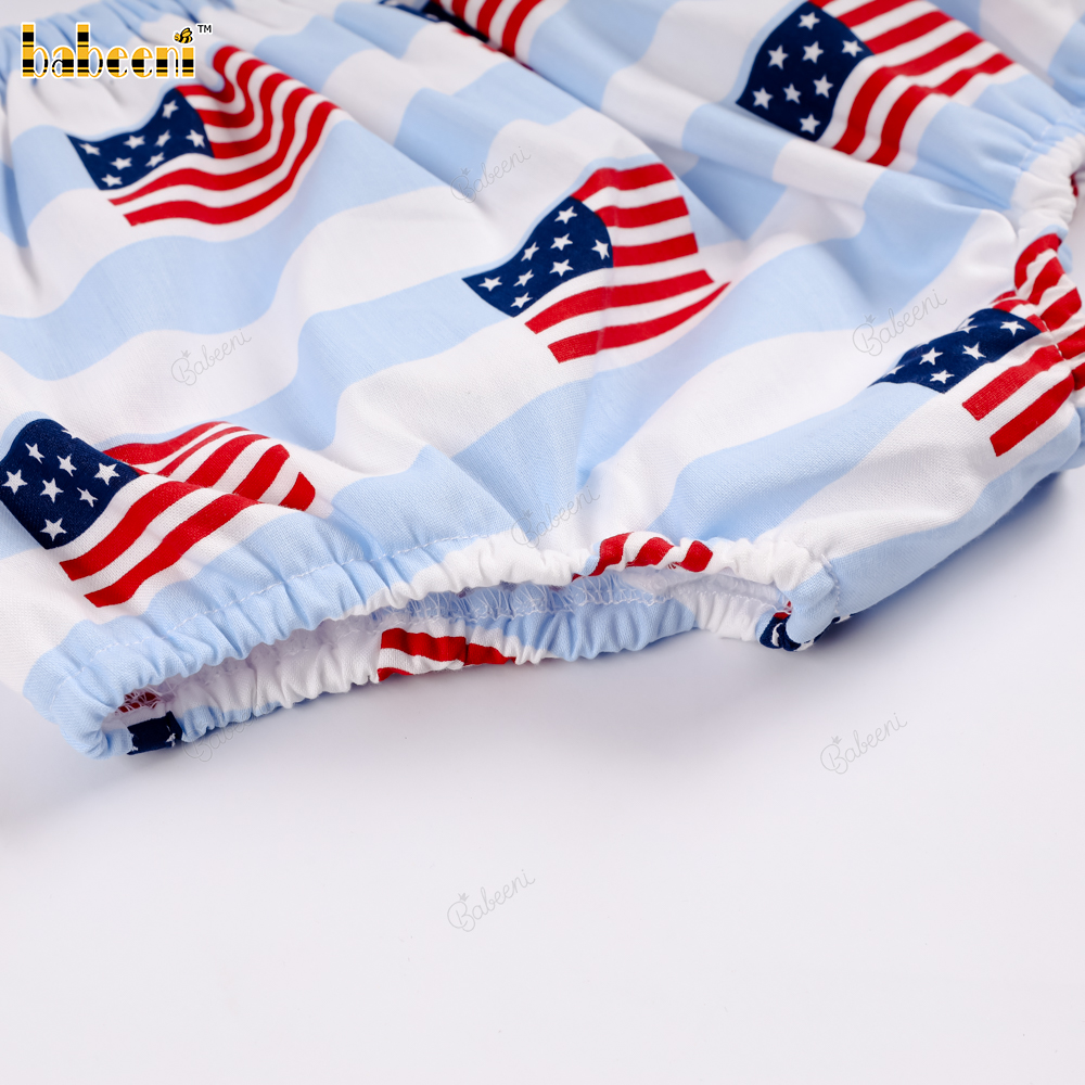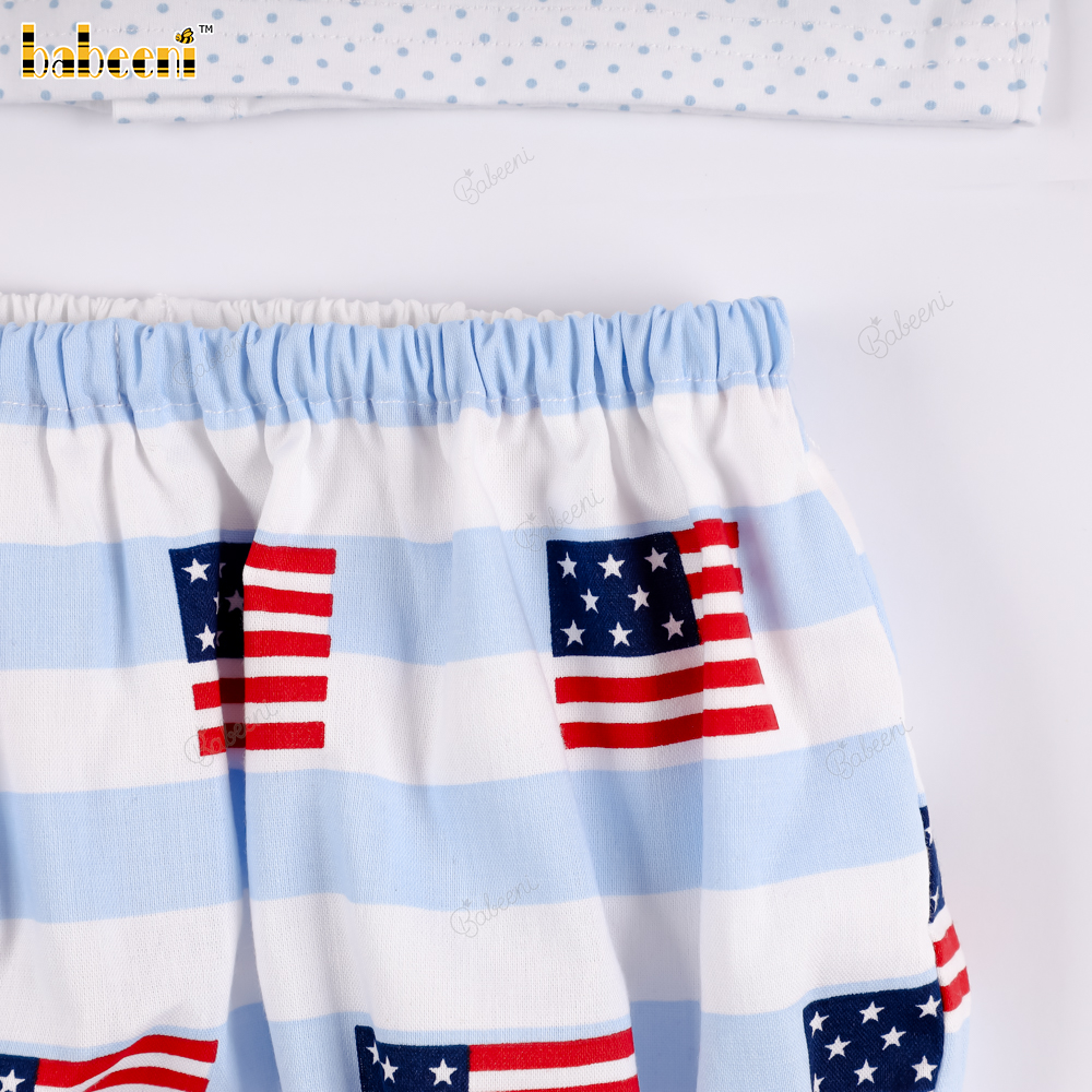 Square-neck t-shirt and bloomer pants set with American flag print.- BB3574
