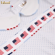 Material: American flag patterned fabric + blue striped pants with American flag print